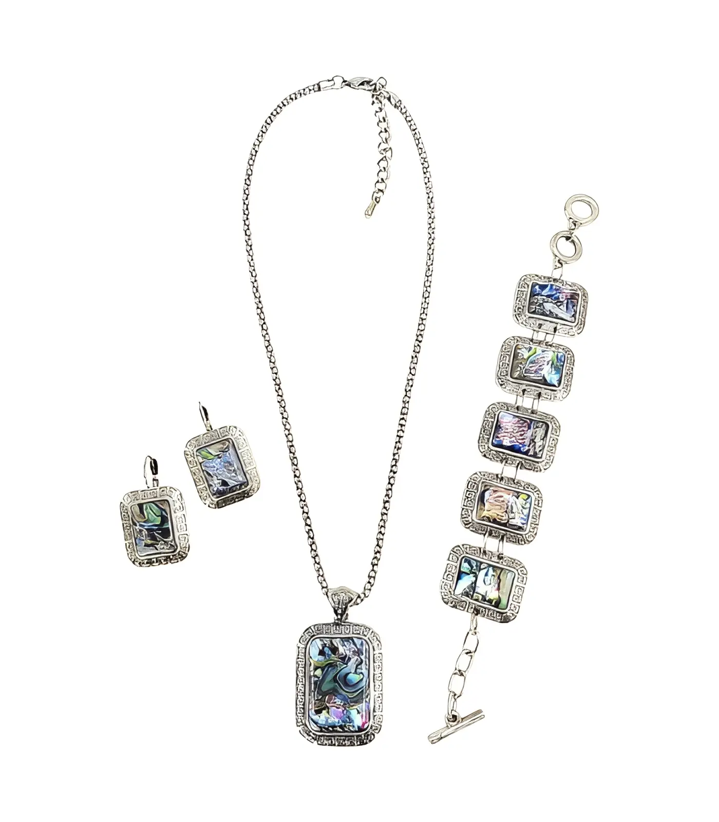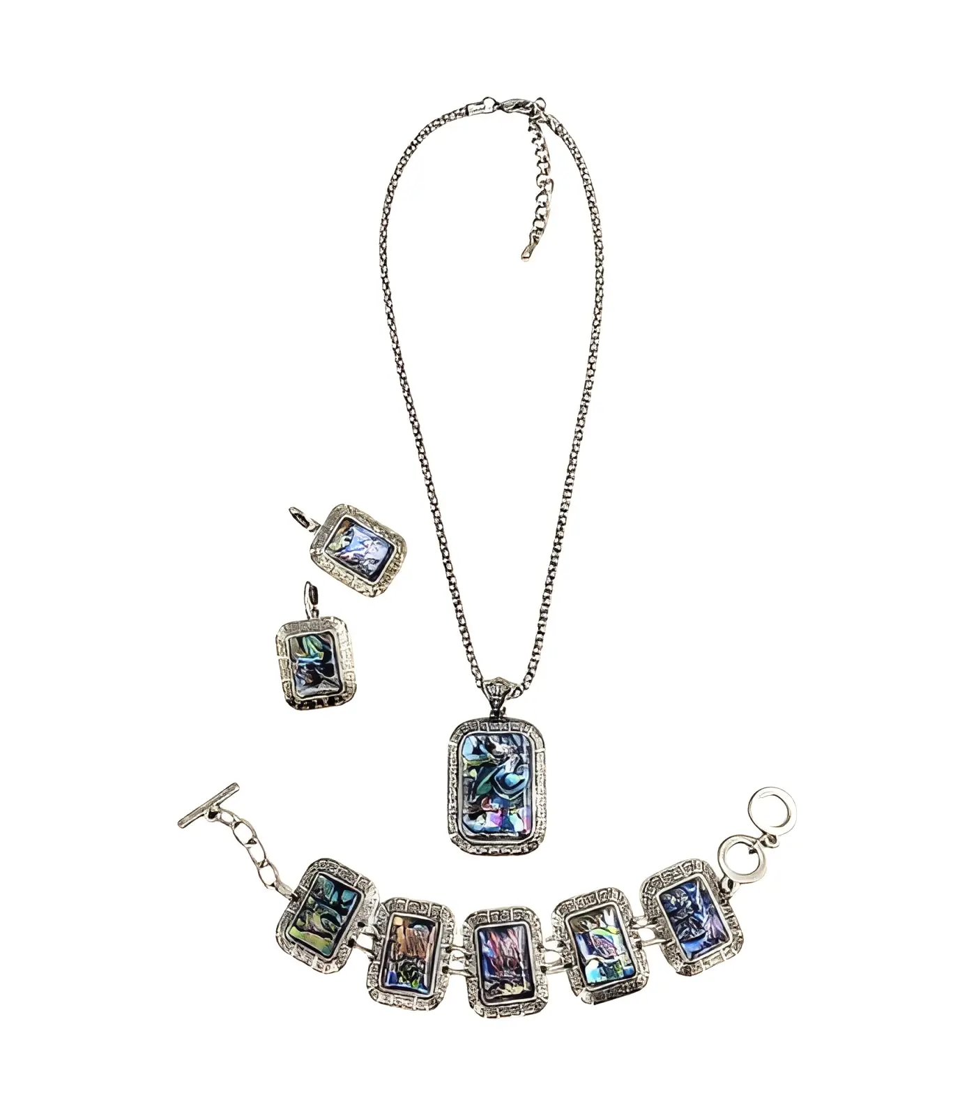 Elegantne kaelakee, käevõru ja kõrvarõngad, mis on kaunistatud abalone koore elementidega ja antiikhõbeda viimistlusega. Täiuslik kingitus või stiilne lisand igapäevasele või pidulikule välimusele.