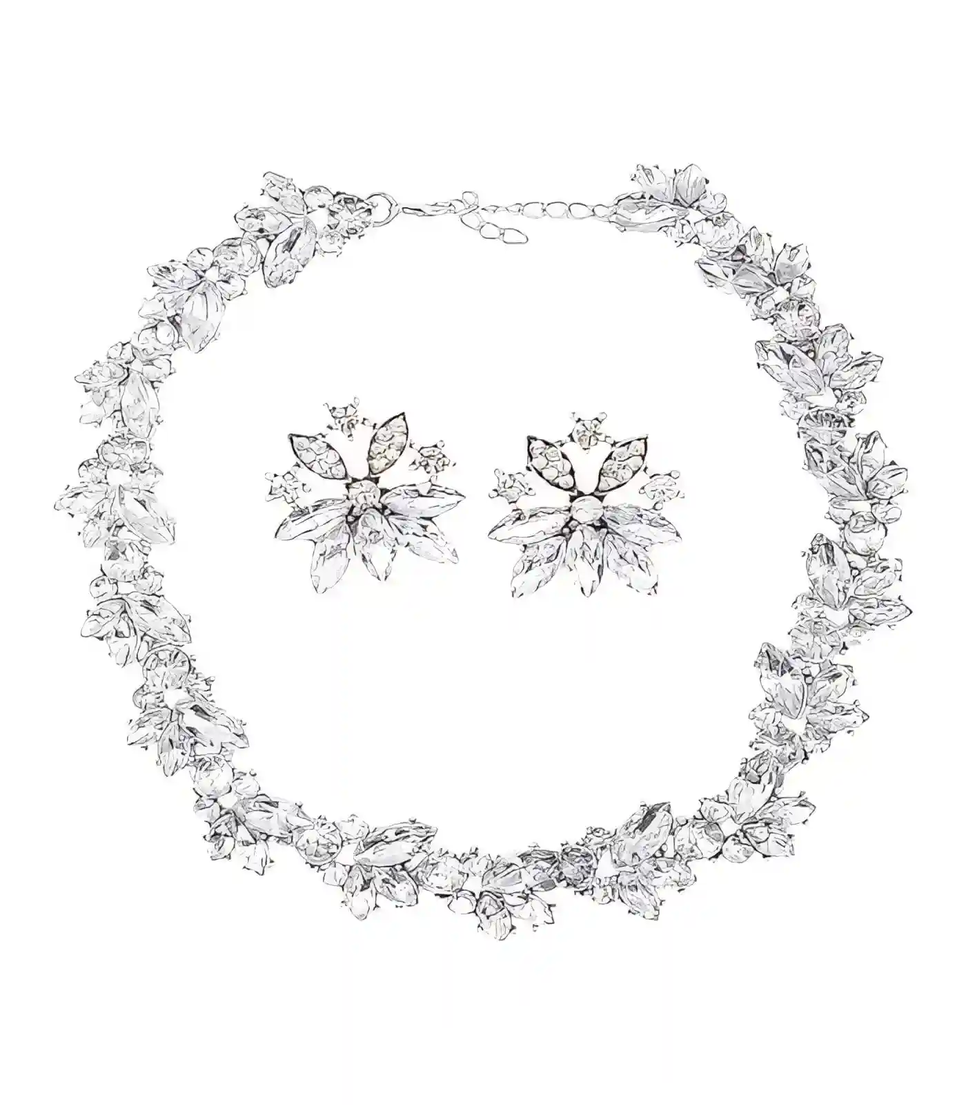 See luksuslik kaelakee ja kõrvarõngaste komplekt on inspireeritud looduse ilust ja elegantsist. Komplekti moodustavad hõbedased lehemotiivid, mis on kaetud sädelevate kristallidega, pakkudes ajatut ja glamuurset välimust. Kaelakee ja kõrvarõngad sobivad suurepäraselt pulmadesse, galaõhtutele ja muudeks pidulikeks sündmusteks. Ideaalne valik neile, kes soovivad väljendada oma armastust elegantsete detailide vastu. Sobib kauniks kingituseks erilistel puhkudel.