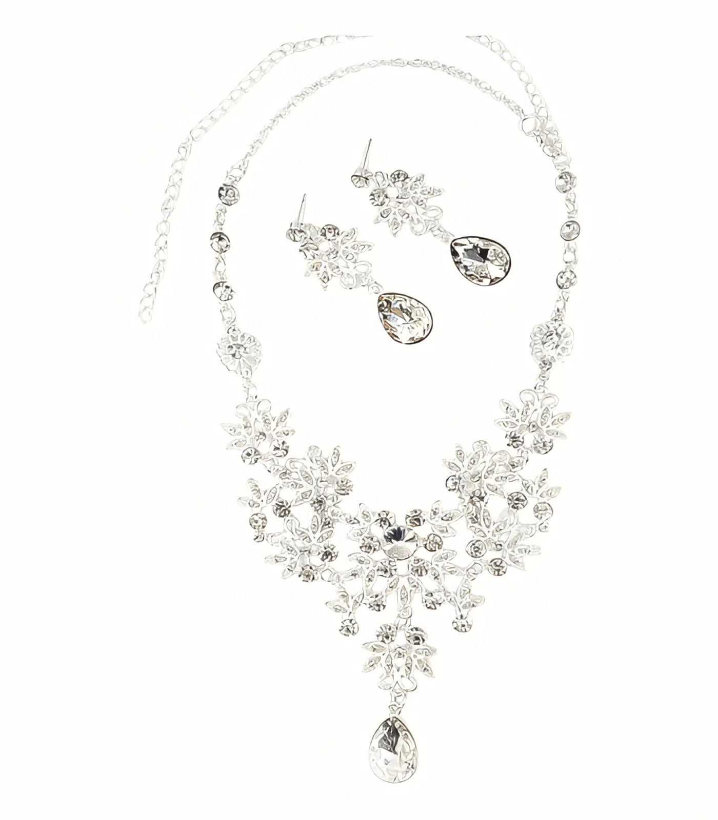 Luksuslik lillemotiividega kaelakee ja kõrvarõngaste komplekt, kaunistatud sädelevate kristallidega.