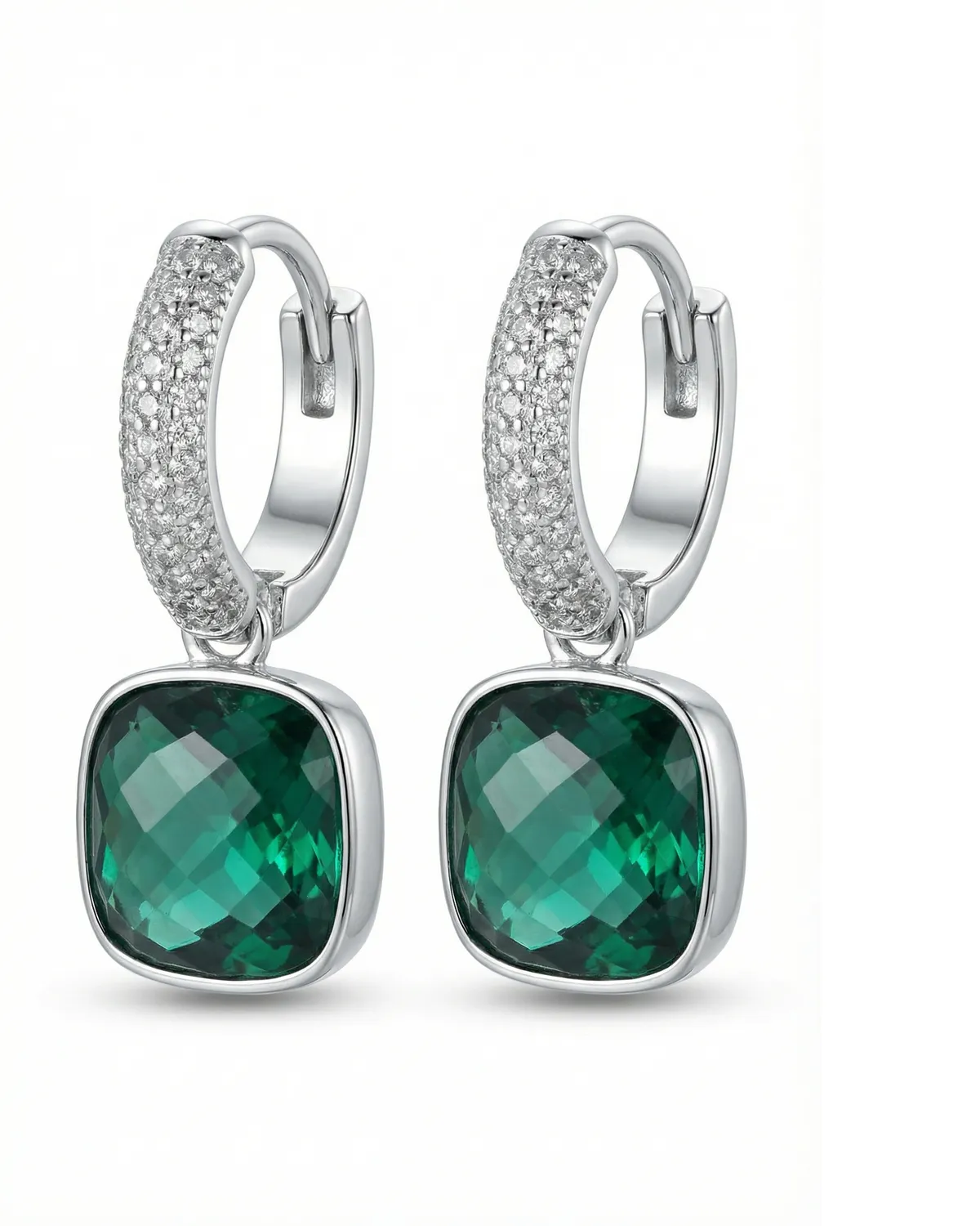 Smaragdrohelise teemantkiviga hõbedased rõnaskõrvarõngad, mis on kaunistatud valgete tsirkooniumkividega.