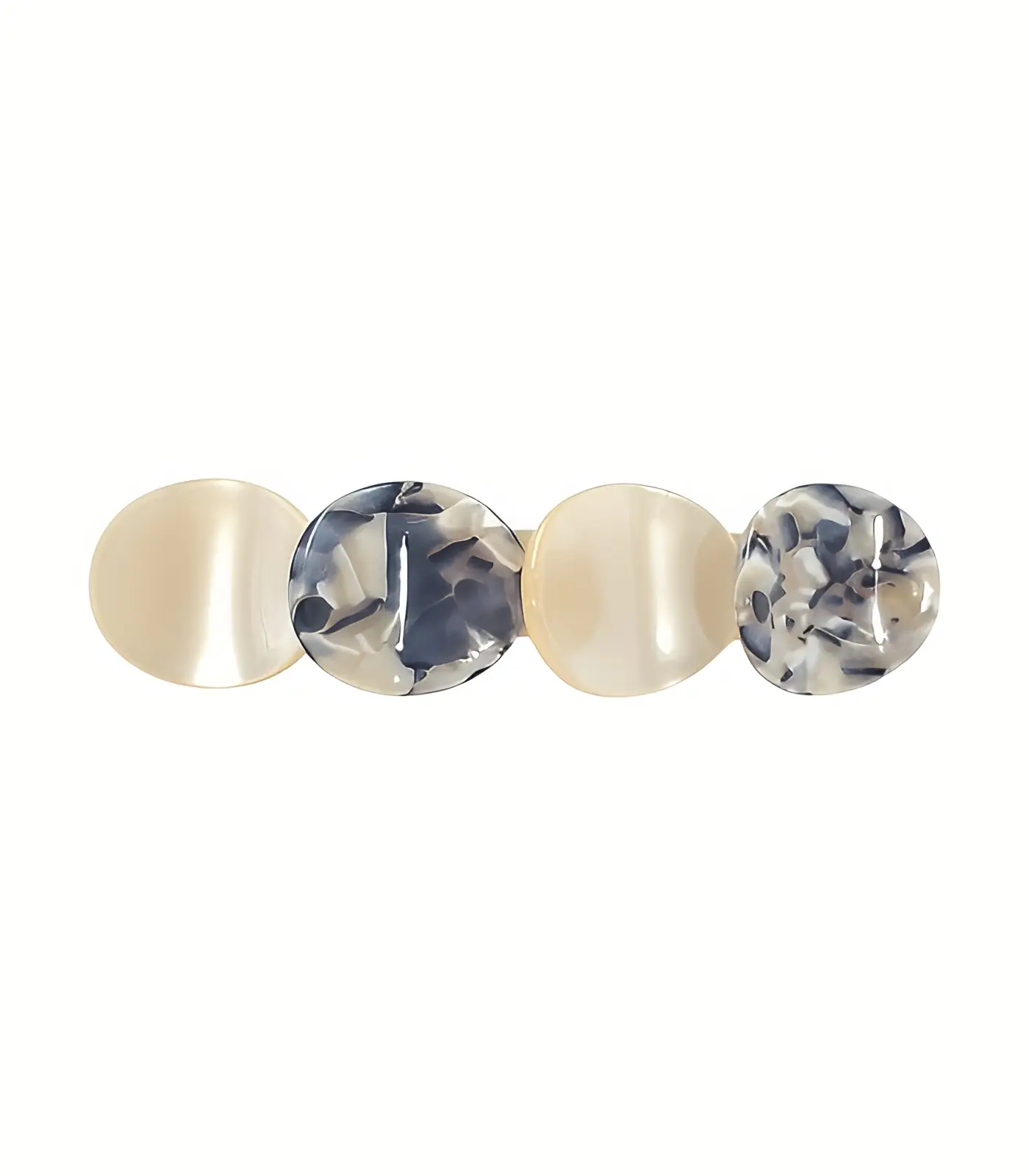 See kaunis juukseklamber on valmistatud kvaliteetsest akrüülmaterjalist, millel on neli eraldi ringikujulist elementi. Klambri värvid on sooja beeži ja tumehalli kombinatsioon, mis loovad elegantse ja ajatu välimuse. Akrüülmaterjal annab tootele läikiva ja sujuva pinna, andes sellele kaasaegse ja stiilse ilme. Metallist klambriosa tagab kindla ja turvalise kinnituse, olles ideaalne igapäevaste soengute kinnitamiseks. Klamber on väike ja sobib juuste osaliseks kinnitamiseks.