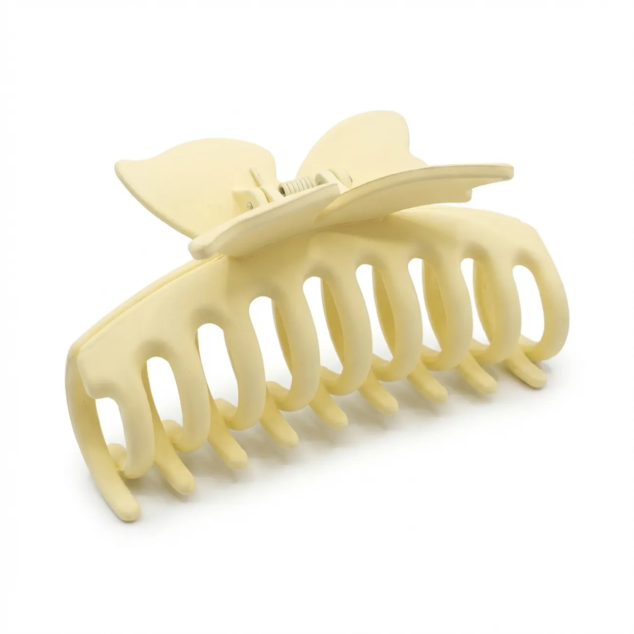 See suur ja pilkupüüdev krabiklamber on disainitud naisele, kes armastab loodusest inspireeritud vorme. Sametine matt pind annab ehtele moodsa ja rafineeritud lõppviimistluse, rõhutades pastelse kollase tooni pehmust ja vältides liigset läiget. Tänu oma 11 cm pikkusele ja tugevatele, sügavatele piidele on see ideaalne abiline pikkade ja paksude juuste kiireks, kuid stiilseks fikseerimiseks, pakkudes püsivust kogu päeva vältel.