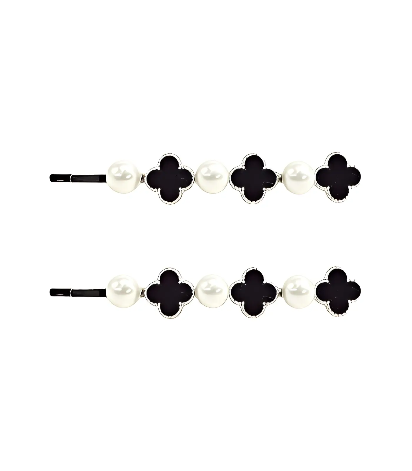 Elegantne juukseklambrite komplekt, mis ühendab mustad kujundid ja valged kunstpärlid. Hõbedased detailid lisavad luksuslikku välimust, tehes sellest ideaalse aksessuaari nii igapäevaseks kasutamiseks kui ka erilisteks sündmusteks.