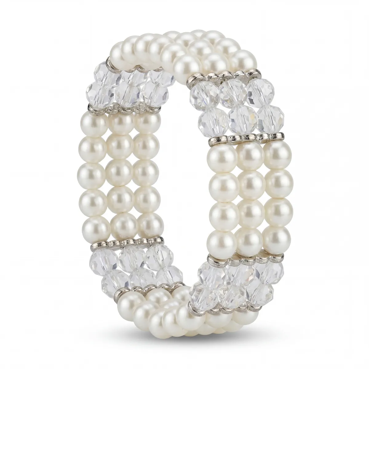 See mitmekihiline lai käevõru on tõeline luksuse ja naiselikkuse sümbol, mis on loodud lisama glamuuri sinu kõige erilisematele hetkedele. Kolmerealine disain ühendab meisterlikult klassikalised soojad beežid kunstpärlid ja kirkalt sädelevad valged klaashelmed, luues valguses sillerdava ja elegantse terviku. Käevõru 1,7 cm laius annab randmele väärika kohalolu, samas kui elastne konstruktsioon tagab, et ehe püsib mugavalt ja kindlalt paigal. See on ideaalne aksessuaar pulmadesse, galaõhtutele või pidulikele vastuvõttudele, muutes iga kandmiskorra kordumatuks ja pidulikuks.
