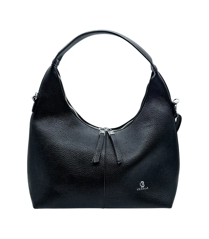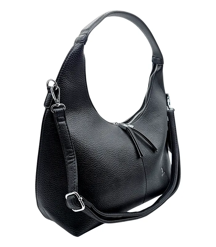 Modernne must käekott, mille kaarjas ja voolujooneline disain loob eriti naiseliku ja pehme silueti. Peeneteraline kunstnaha tekstuur lisab visuaalset sügavust, samas kui minimalistlik vorm hoiab koti stiilse ja ajatu. Hõbedased detailid annavad kaasaegse sära, rõhutades koti kvaliteetset ja šikki välimust. Silmapaistev mudel, mis täiendab iga igapäeva- või kontorilook’i.