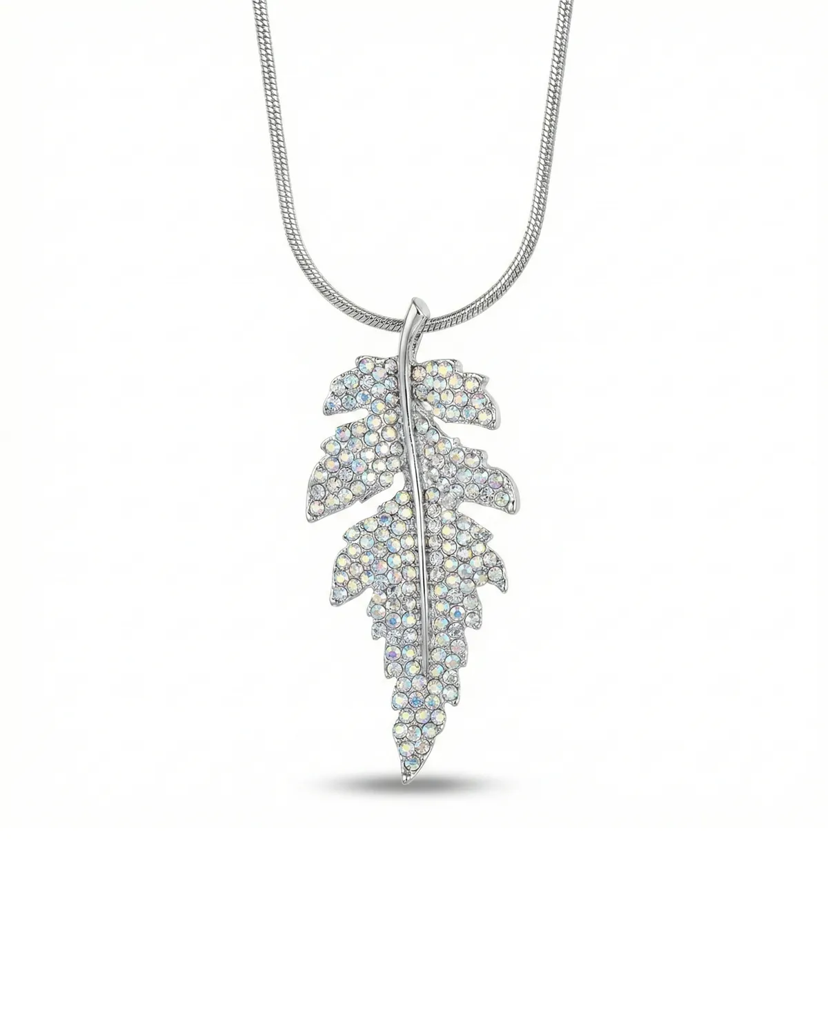 See on lummav ja elegantne ehe, mis toob esile looduse ilu selle kõige säravamas vormis. Ripats kujutab endast sihvakat ja detailset lehte, mille pind on tihedalt kaetud vikerkaarevärviliselt sillerdavate kristallidega (AB-kristallid). Tänu erilisele lihvile püüavad kristallid valgust ja peegeldavad seda pehmetes pastelltoonides, luues maagilise sädeme. Ripats ripub klassikalisel ja tugeval hõbedasel maoketil, mis rõhutab ehte peenust. See pikk kaelakee on ideaalne valik, et lisada oma välimusele naiselikku graatsiat ja pidulikku helki.