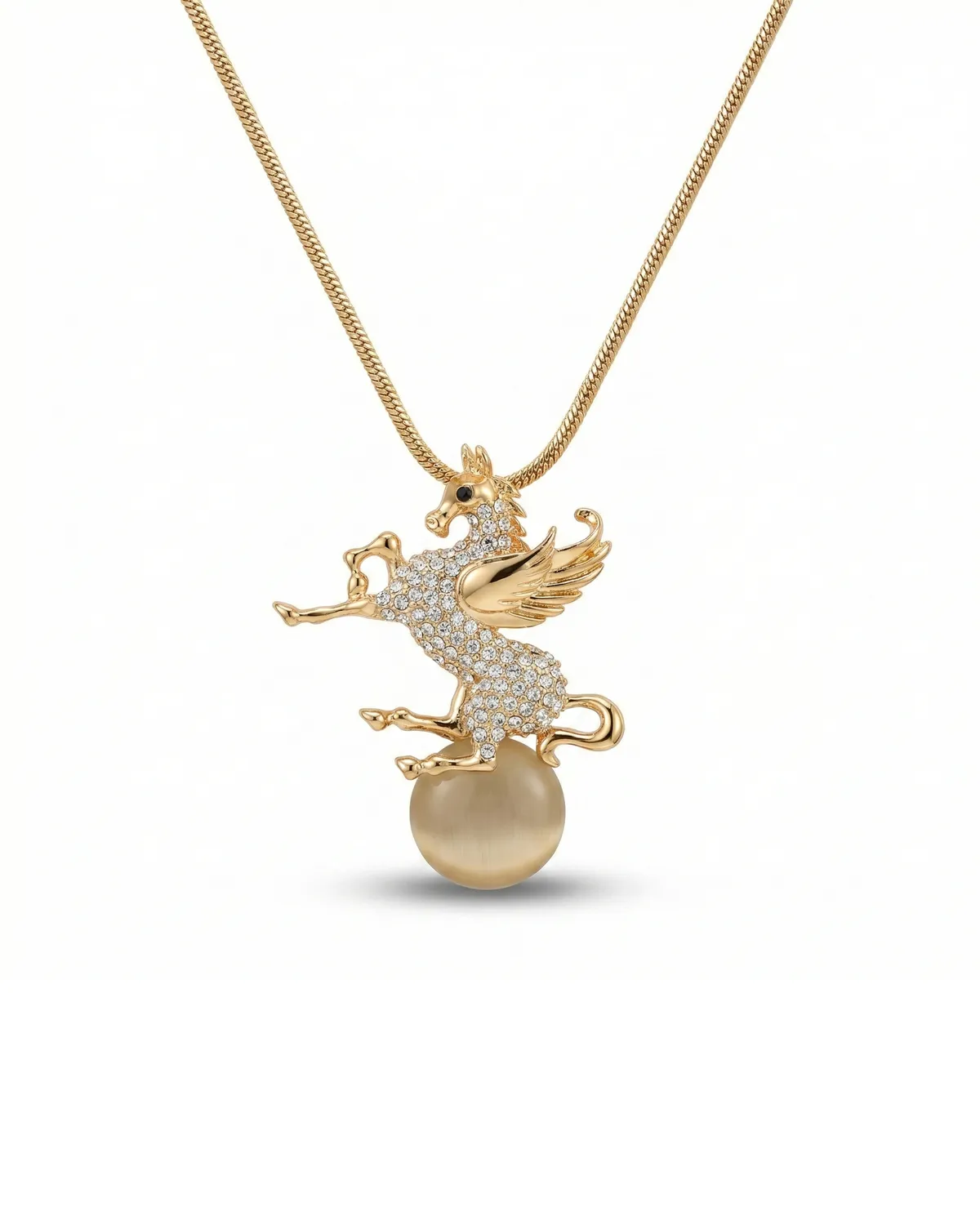 Lummav ja mütoloogiline kuldset tooni kaelaehe, mille ripatsiks on graatsiline tiibadega hobune ehk pegasus. Pegasuse keha on rikkalikult kaunistatud säravate kirgaste kivikestega ning ta toetub suurele, mahedalt kumavale kuldsele pärlile. See on tõeline meistriteos, mis sümboliseerib vabadust ja unistusi, olles samal ajal silmapaistvalt luksuslik aksessuaar.