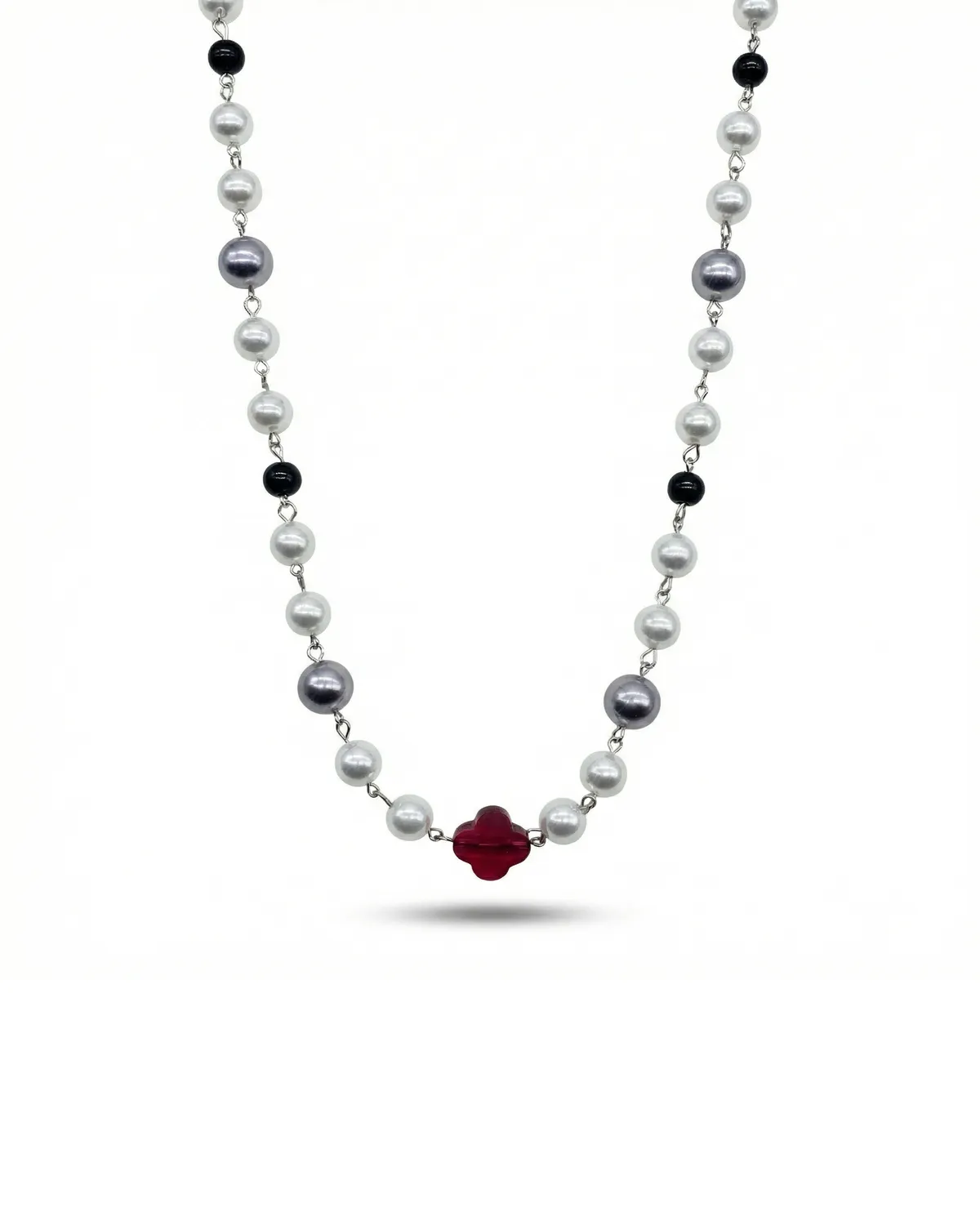 Elegantne ja isikupärane pikk kaelakee, mis mängib klassikaliste toonide ja ühe särtsaka värviaktsendiga. Ehte moodustavad vaheldumisi lükitu puhtad valged, sügavad hallid ja mustad pärlid, mis on ühendatud peene hõbedase ketiga. Kaelakee keskseks pilgupüüdjaks on kirkast punasest klaasist ristikheina kujuline detail, mis sümboliseerib õnne ja lisab disainile mängulisust. See pikk kee on suurepärane aksessuaar, mida saab kanda nii ühekordselt kui ka kahekordselt ümber kaela, andes igale riietusele stiilse ja viimistletud ilme.