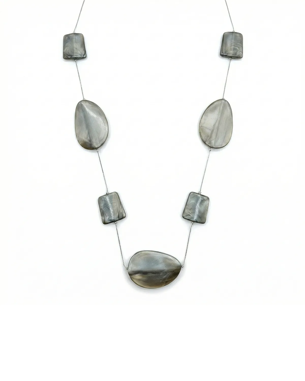 Elegantne kaelakee, mis lisab teie välimusele peene ja luksusliku puudutuse. Akrüülkivid, mis on kujundatud erinevate vormide ja marmorise tekstuuriga, muudavad selle kaelakee ainulaadseks aksessuaariks. Kerge ja mugav kanda, sobib ideaalselt nii igapäevaseks stiiliks kui ka pidulikeks sündmusteks.