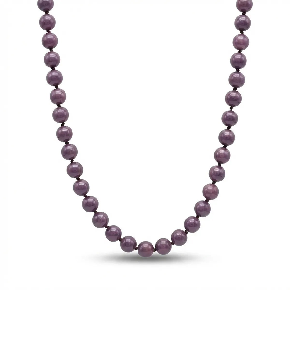 See on elegantne ja luksusliku olemusega ehe, mis püüab pilku oma sügava ja salapärase värvitooniga. Kaelakee koosneb ühtlastest ploomililla läikega pärlitest, mis on üksteisest eraldatud peente sõlmedega – see traditsiooniline meetod tagab kee ilusa langevuse ja vastupidavuse. Eriti mugavaks muudab ehte tugev magnetkinnitus, mis võimaldab keed sekunditega peale panna ja eemaldada. See on täiuslik aksessuaar neile, kes otsivad klassikalist vormi, kuid soovivad eristuda tavapärasest valgest pärlist.