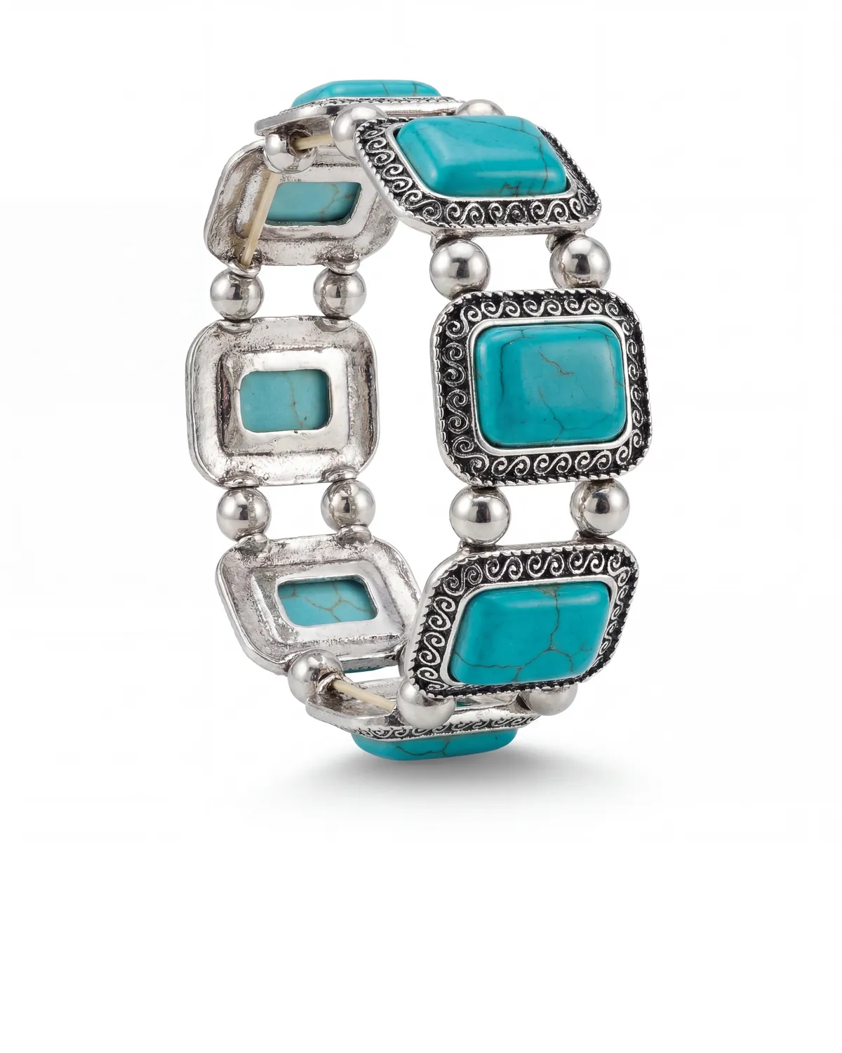 Meta Description: Suursugune ja etnilise hõnguga antiikne käevõru türkiissiniste kivide ning hõbedase ornamendiga. Julge statement-aksessuaar, mis lisab Sinu stiilile luksuslikku värvi!
