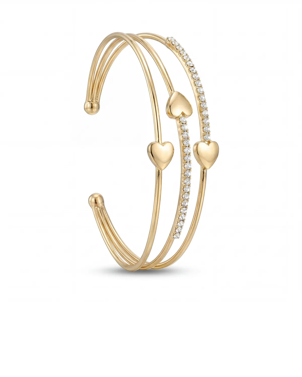 Meta Description: Romantiline ja naiselik kolmerealine kuldne käevõru armsate südamekujundustega. Veniv ja mugav avatud disain – täiuslik luksuslik aksessuaar igaks sündmuseks!