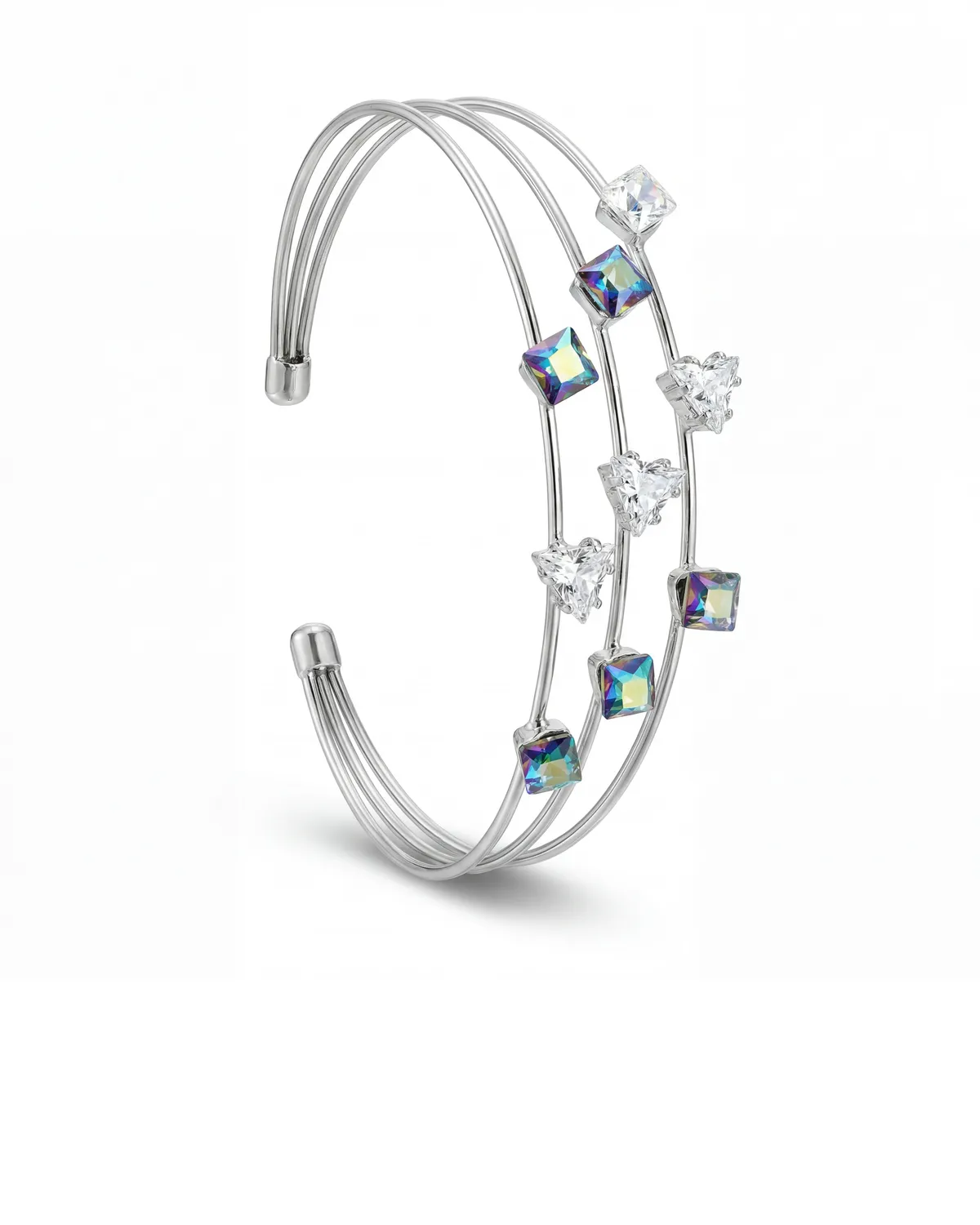 See on kütkestav ja modernne aksessuaar, mis toob Sinu randmele öise tähistaeva maagiat. Käevõru kolmerealine avatud disain on õhuline ja dünaamiline, kus hõbedaselt läikival raamil helgivad erineva kuju ning suurusega kristallid. Kirkad ja rohekassinised fassetitud kivid püüavad valgust mänguliselt, luues luksusliku, kuid samas kerge ning kaasaegse terviku. See on ehe, mis ühendab minimalistliku joone ja julge kristallisära, sobides ideaalselt naisele, kes armastab detaile, mis eristuvad tavapärasest.