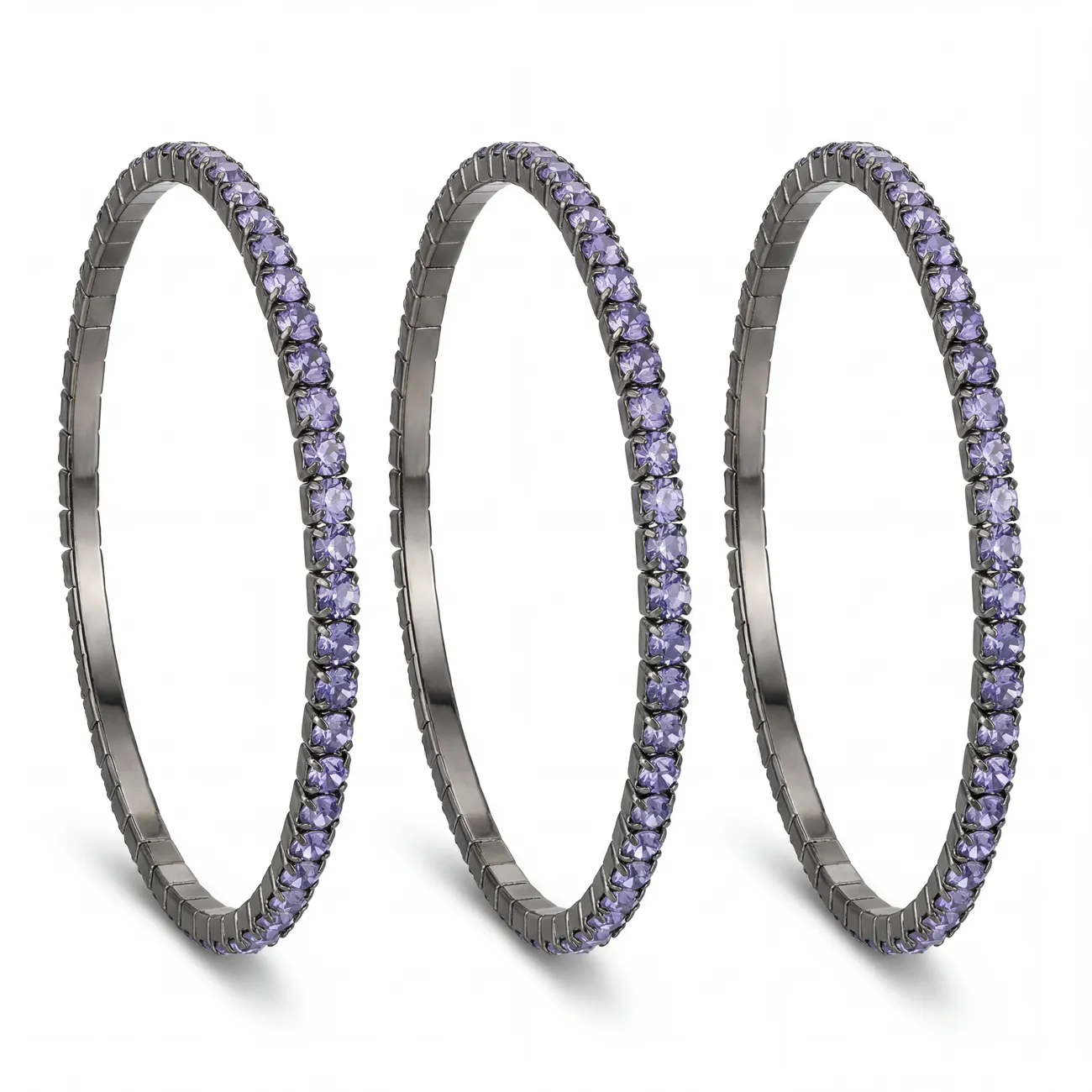 See lummav käevõrukomplekt “Särav lilla” on loodud naisele, kes armastab peent elegantsi ja naiselikku sära. Komplekt koosneb kolmest identsest hõbedasest käevõrust, mis on tihedalt kaunistatud sädelevate lillade kivikestega. See stiilne ja mitmekülgne valik lisab igale välimusele värvi ja luksuslikku helki, sobides suurepäraselt nii igapäevaseks kandmiseks kui ka pidulikeks hetkedeks. Käevõrude koosmõju randmel loob dünaamilise ja sillerdava efekti, mis püüab valgust iga Sinu liigutusega.