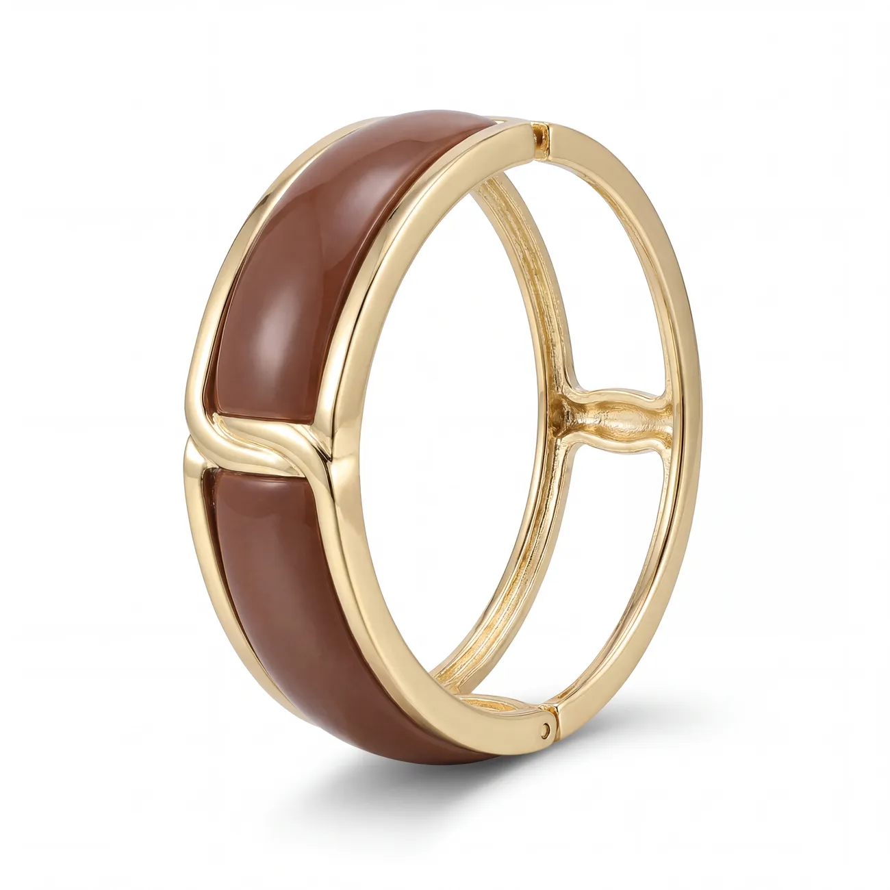 See on ääretult rafineeritud ja ajatu hingedega käevõru, mis toob Sinu randmele klassikalist väärikust. Kuldne, pehmelt voolava joonega raam on täidetud läikiva šokolaadipruuni emailiga, mis püüab valgust ja mõjub ääretult soojalt. Käevõru tagakülje topelt-vitsaga disain lisab ehtele õhulisust ja tagab, et mansett püsib randmel stabiilselt ning mugavalt. See on ehe, mis ei karju tähelepanu järele, vaid lummab oma kvaliteetse viimistluse ja harmoonilise värvikombinatsiooniga.