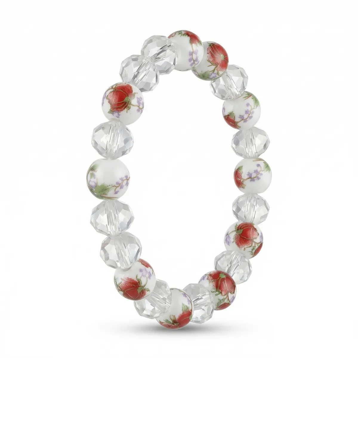 See romantiline ja naiselik käevõru on täiuslik põiming traditsioonilisest portselanikunstist ja modernsest sillerdusest. Ehte fookuses on siledad valged kuulid, mida ehib peen punaste lillede ja lillade õitega muster, meenutades suvist aeda või klassikalist portselanimaali. Neid tasakaalustavad kirkad fassetitud kristallid, mis püüavad valgust ja lisavad ehtele luksuslikku sära. Elastne konstruktsioon muudab selle käevõru kandmise ülimalt mugavaks – see on täiuslik aksessuaar neile, kes hindavad detailirohkust ja õrna, boheemlaslikku elegantsi.