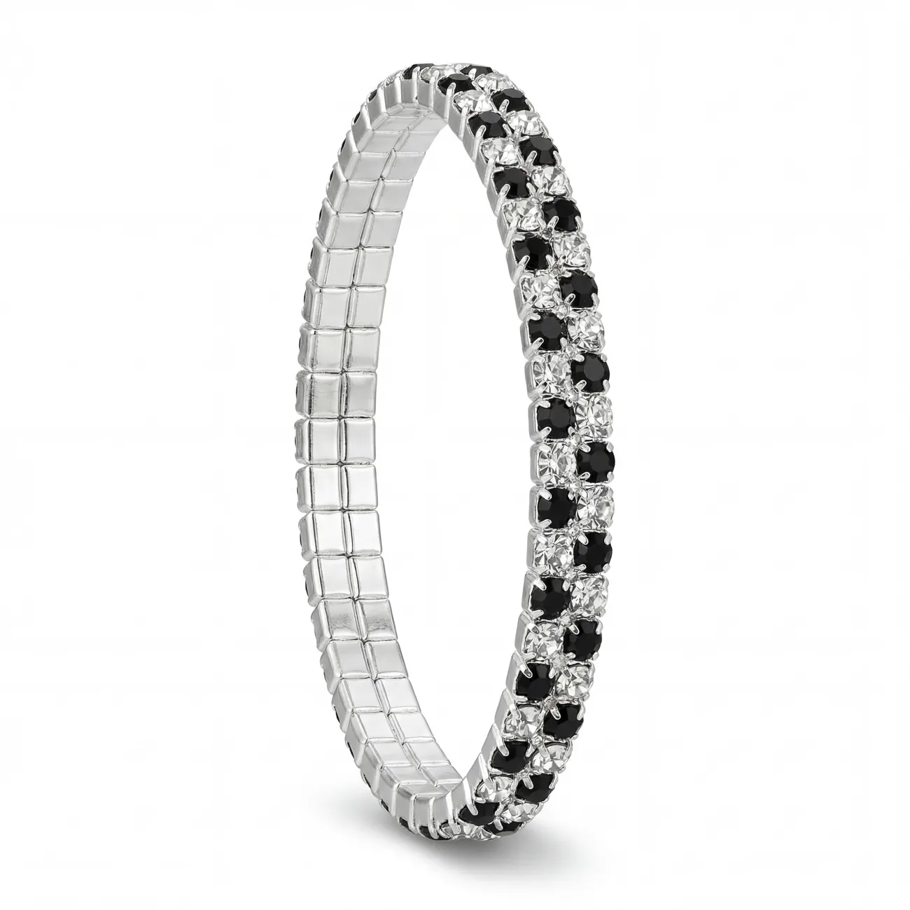 See on ääretult šikk ja modernse karakteriga kahekordne kristallkäevõru, mis toob Sinu stiili dünaamilist rütmi. Hõbedasel põhjal vahelduvad korrapäraselt süsimustad ja läbipaistvad kristallid, luues visuaalselt põneva graafilise mustri. Ehte suurimaks trumbiks on selle nutikas veniv konstruktsioon – puuduvad igasugused kinnitused ja lukud, mis tähendab, et käevõru libiseb randmele sekundiga ja kohandub täiuslikult Sinu käe kujuga. See on aksessuaar, mis tõestab, et “statement”-ehe võib olla ka üllatavalt kerge ja mugav kanda.