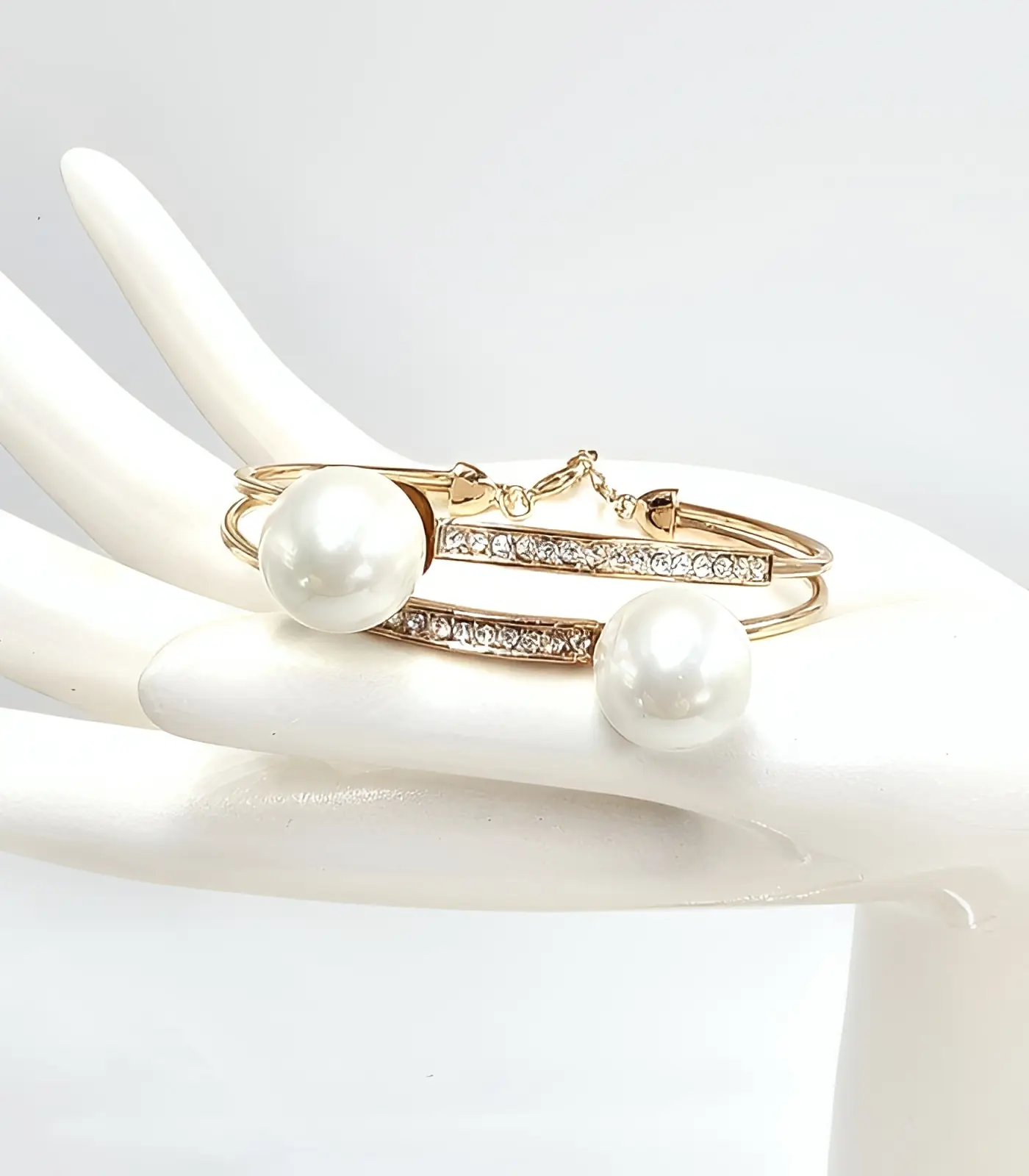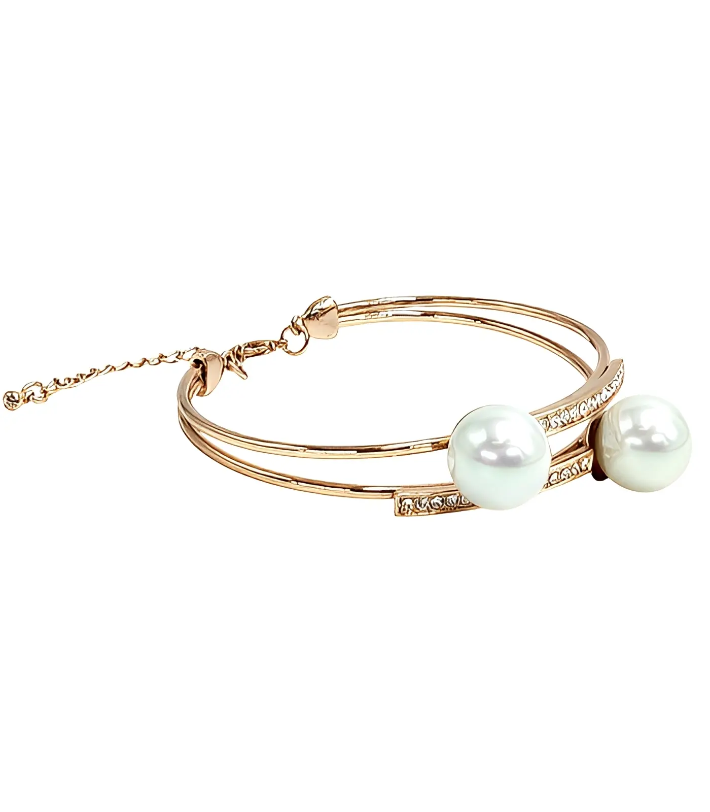 Käevõru – Valged pärlid säravad kuldselt ja koosnevad kahest elegantsest sädelevast reast. See kaunis ja klassikaline aksessuaar on kaunistatud kahe suure kunstpärliga, mis sädelevad valgelt, andes käevõrule luksusliku ja ajatu ilme. Sobib suurepäraselt nii igapäevaseks kandmiseks kui ka pidulikeks sündmusteks, lisades iga riietusele peenelt rafineeritud elegantsi.