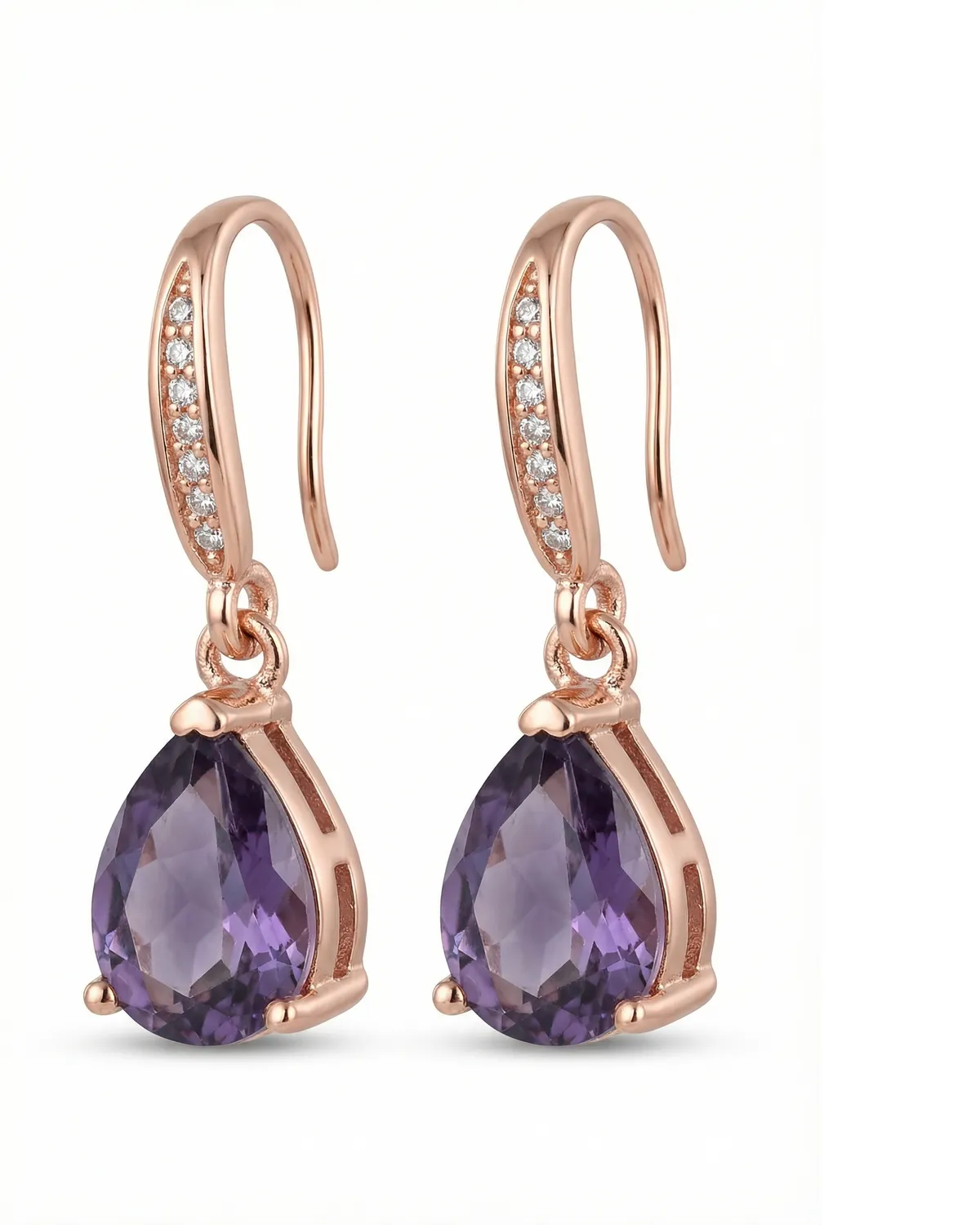 Roosa kullatud ripatskõrvarõngad, millel on suured lillad pisarakujulised kristallid ja säravad detailid.