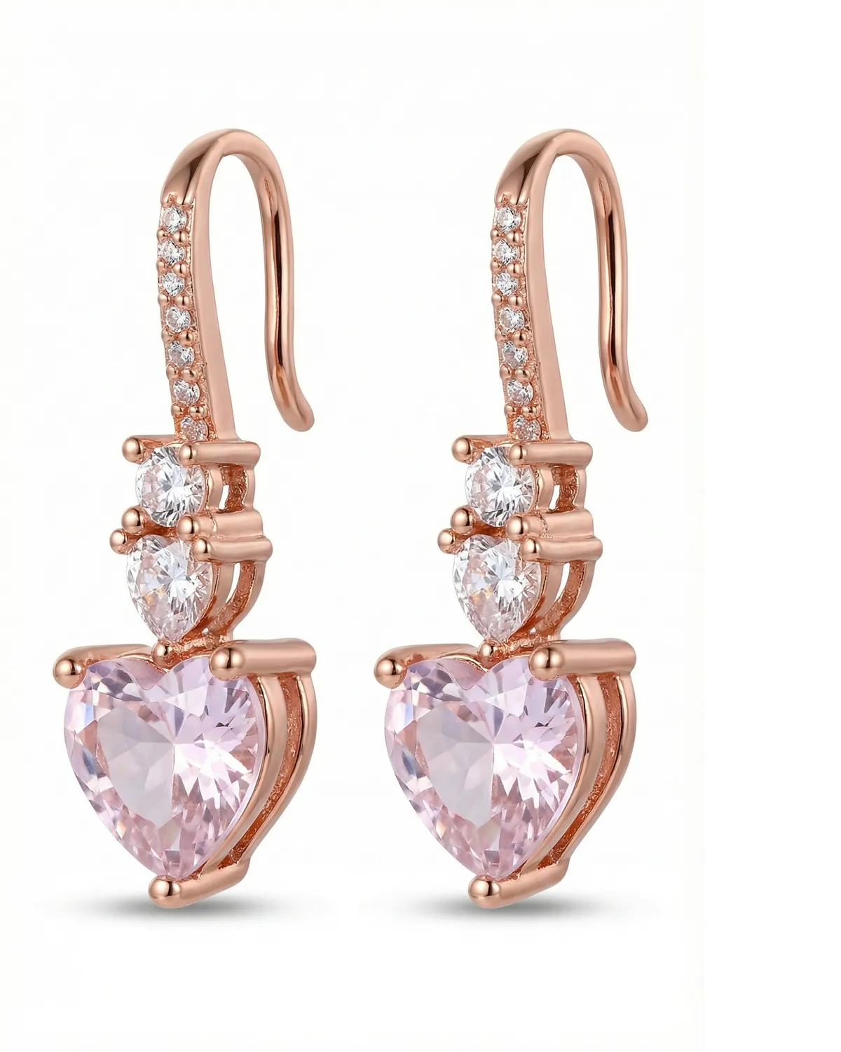 Roosa kullaga rippuvad kõrvarõngad südamekujuliste kristallidega, mis on elegantselt ripatsitena järjestatud.