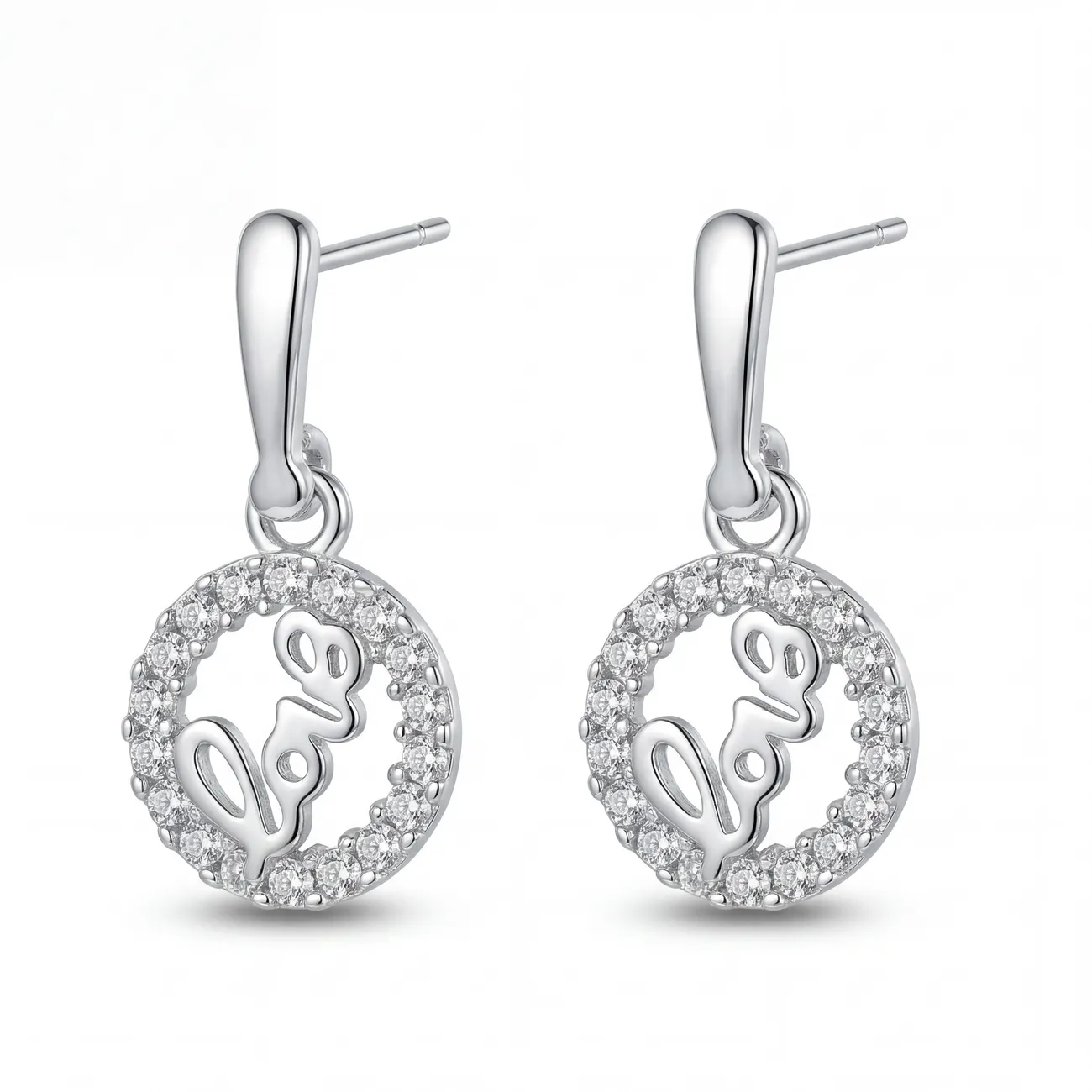 Need on ääretult graatsilised ja säravad rippuvad kõrvarõngad, mis püüavad pilke oma detailirohkusega. Hõbedasel põhjal asuvad ümarad medaljonid on ääristatud kirkate kristallidega, mis raamivad kaunilt keskel asuvat kütkestavat “Love”-kirja. Kristallide peen helk ja poleeritud metalli jahe läige loovad harmoonilise terviku, mis sillerdab lummavalt igal liigutusel. See on aksessuaar naisele, kes armastab romantilist sümboolikat ja soovib, et tema ehted jutustaksid lugu.