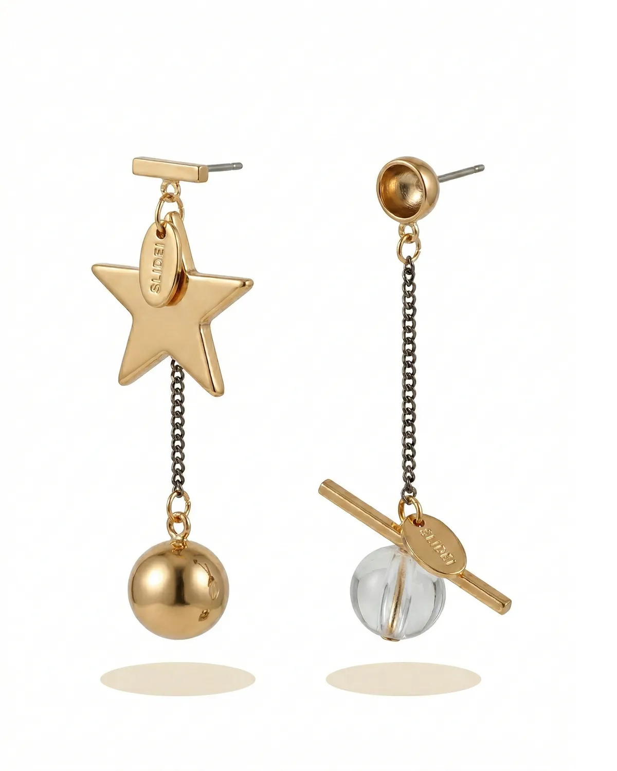 Need on kõrvarõngad julgele ja loovale naisele, kes armastab “mix & match” stiili ning soovib eristuda. Asümmeetriline disain on ehtemaailma üks kuumimaid trende – kuigi mõlemad kõrvarõngad jagavad ühist kuldset koloriiti ja elemente, on nende kompositsioon meelega erinev. Ühel pool särab massiivne kuldne täht koos rippuva sileda metallkuuliga, teisel pool aga peen kett, mis lõppeb läbipaistva kristallkuuli ja modernse horisontaalse vardaga. See on mänguline, kunstiline ja äärmiselt kaasaegne valik, mis lisab Sinu välimusele intellektuaalset šikki.