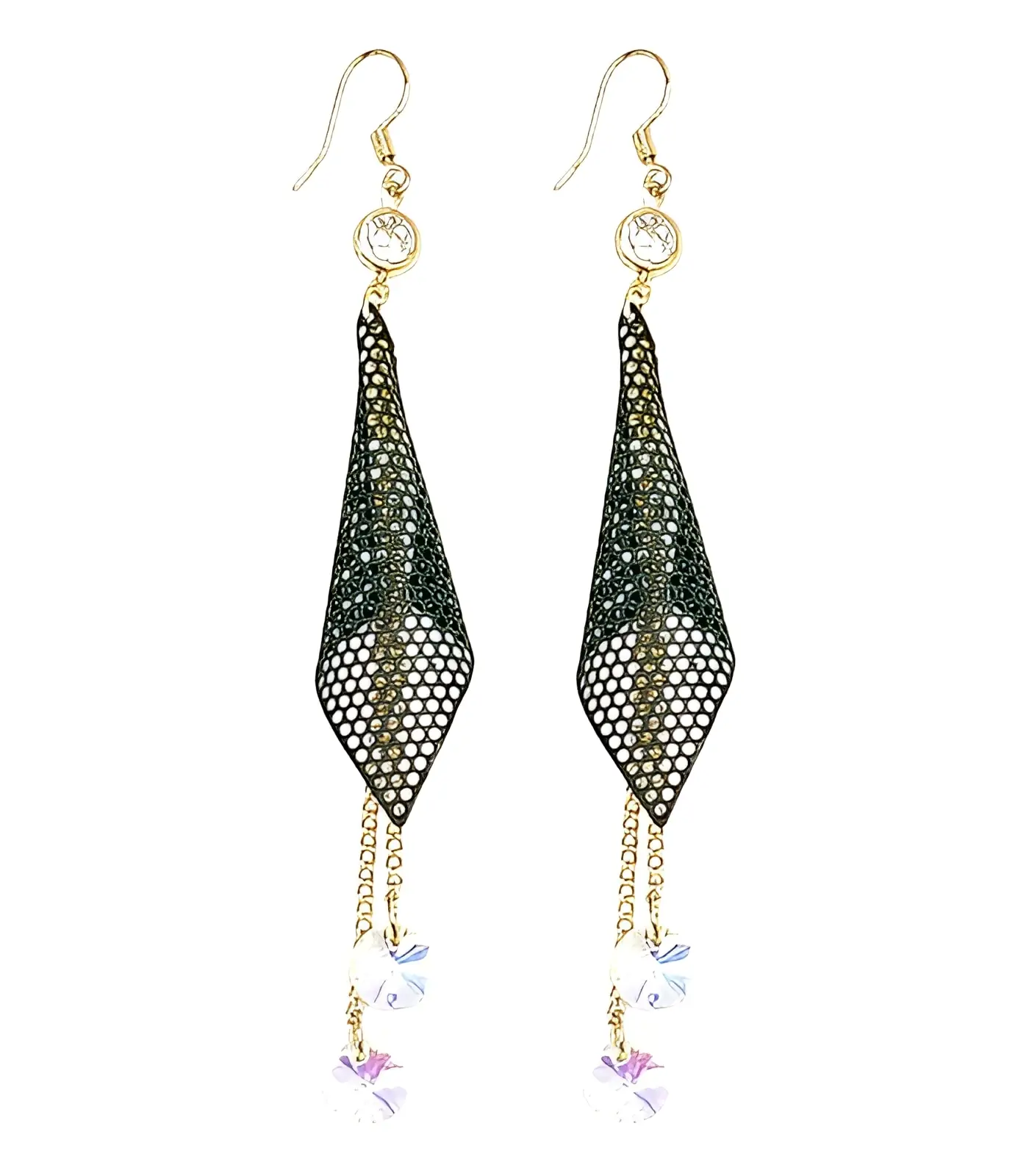 Need kõrvarõngad on täis õrnust ja peent elegantsi. Ülaosas asuvad kuldsete detailidega kristallid, mis lisavad kõrvarõngastele sära, samas kui allosas ripuvad õhulised võrkmaterjalist elemendid. Need moodustavad elegantsed ja silmatorkavad kujundid, pakkudes täiuslikku tasakaalu modernsuse ja klassikalise ilu vahel. Ideaalne valik igaks eriliseks sündmuseks või igapäevaseks kandmiseks, et anda oma stiilile peen kaunistus.