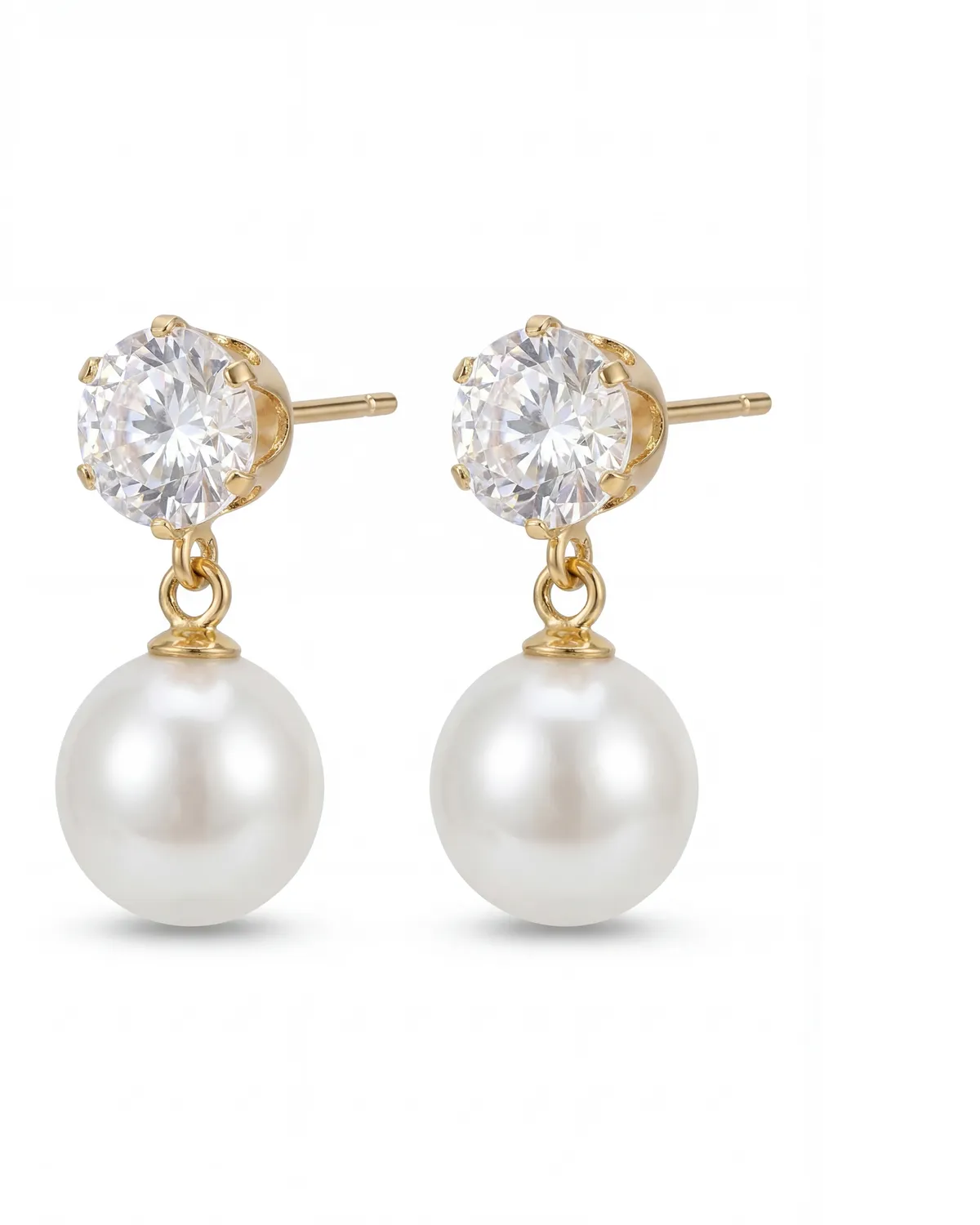 Säravad kivikestega nõelkõrvarõngad rippuvate läikiv valgete pärlitega, mis lisavad elegantsi ja luksuslikkust igale riietusele.
