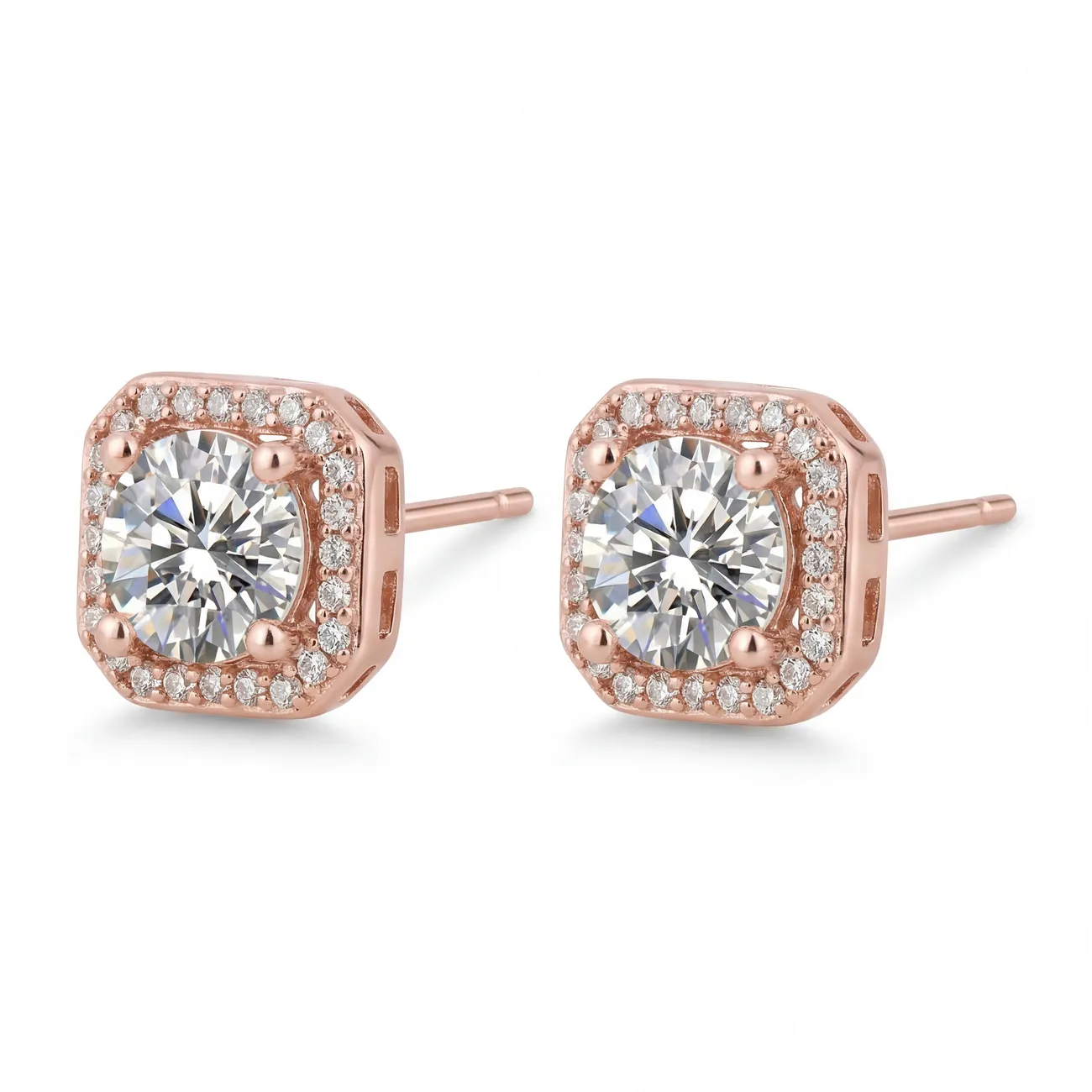Roosakuldsed nõelkõrvarõngad kandilise kujundusega, mille keskmes särav kristall, ümbritsetuna väikeste tsirkooniumkividega.