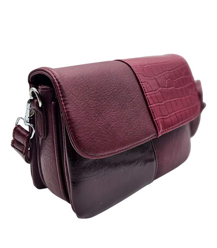 Modernne bordoopunane õlakott, mille välimust ilmestab efektne mitme tekstuuri kombinatsioon — matist kunstnahast kuni läikiva ja krokodillimustrilise pinnani. Kaheosalise klapi geomeetriline ja kontrastne viimistlus loob luksusliku ning trendika üldmulje. Kerge struktuur, modernsed jooned ja visuaalne sügavus muudavad selle kotimudeli pilkupüüdvaks aksessuaariks igapäevarõivaste juurde.