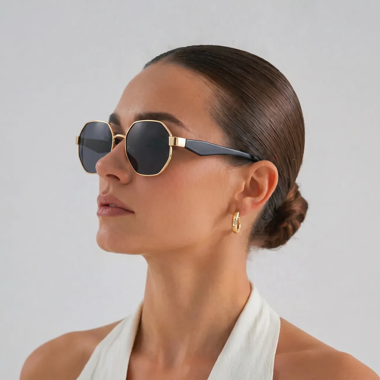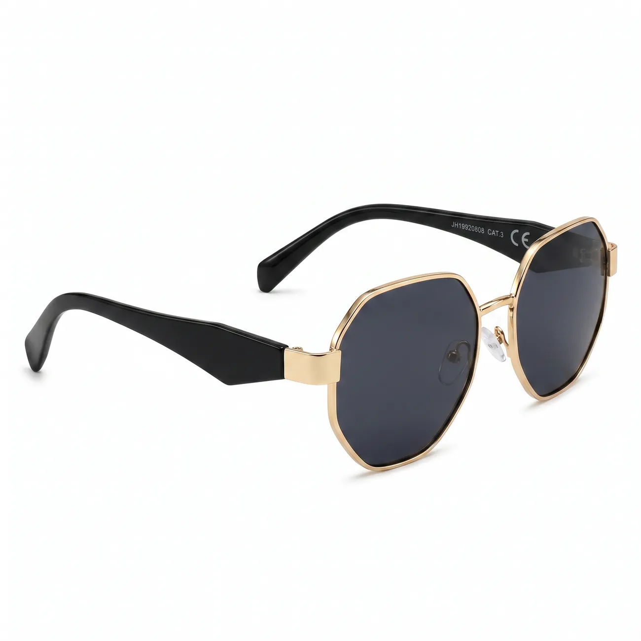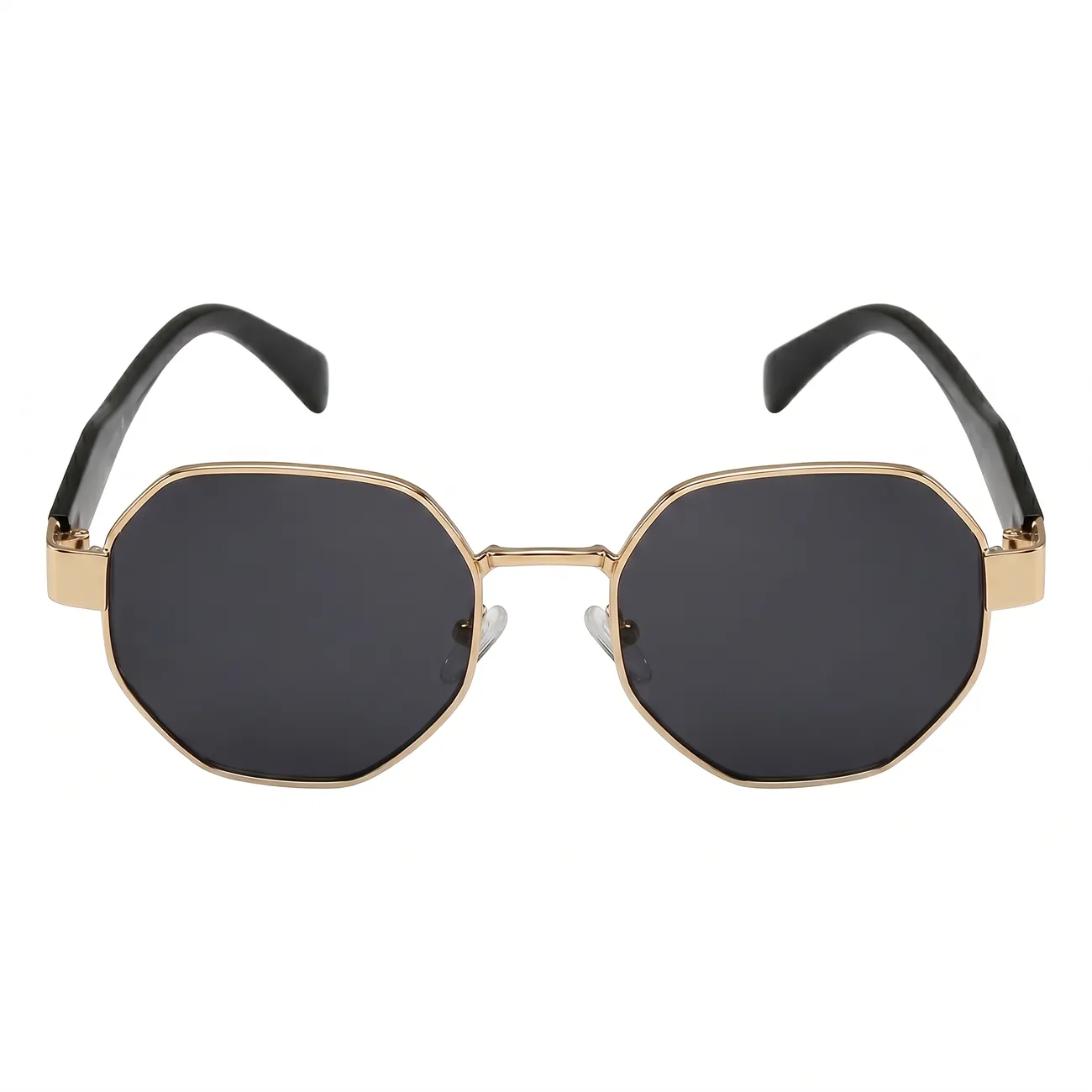 Lisa oma välimusele arhitektuurset elegantsi ja julget modernsust. Need unikaalsed kaheksanurkse raamiga päikeseprillid on loodud neile, kes soovivad massist eristuda. Peen kuldne metallraam ümbritseb tumedaid klaase, luues luksusliku kontrasti laiade mustade sangadega. See geomeetriline disain ei ole lihtsalt aksessuaar, vaid tugev stiiliavaldus, mis raamib nägu jõuliselt ja trendikalt, pakkudes samal ajal maksimaalset kaitset ja mugavust.