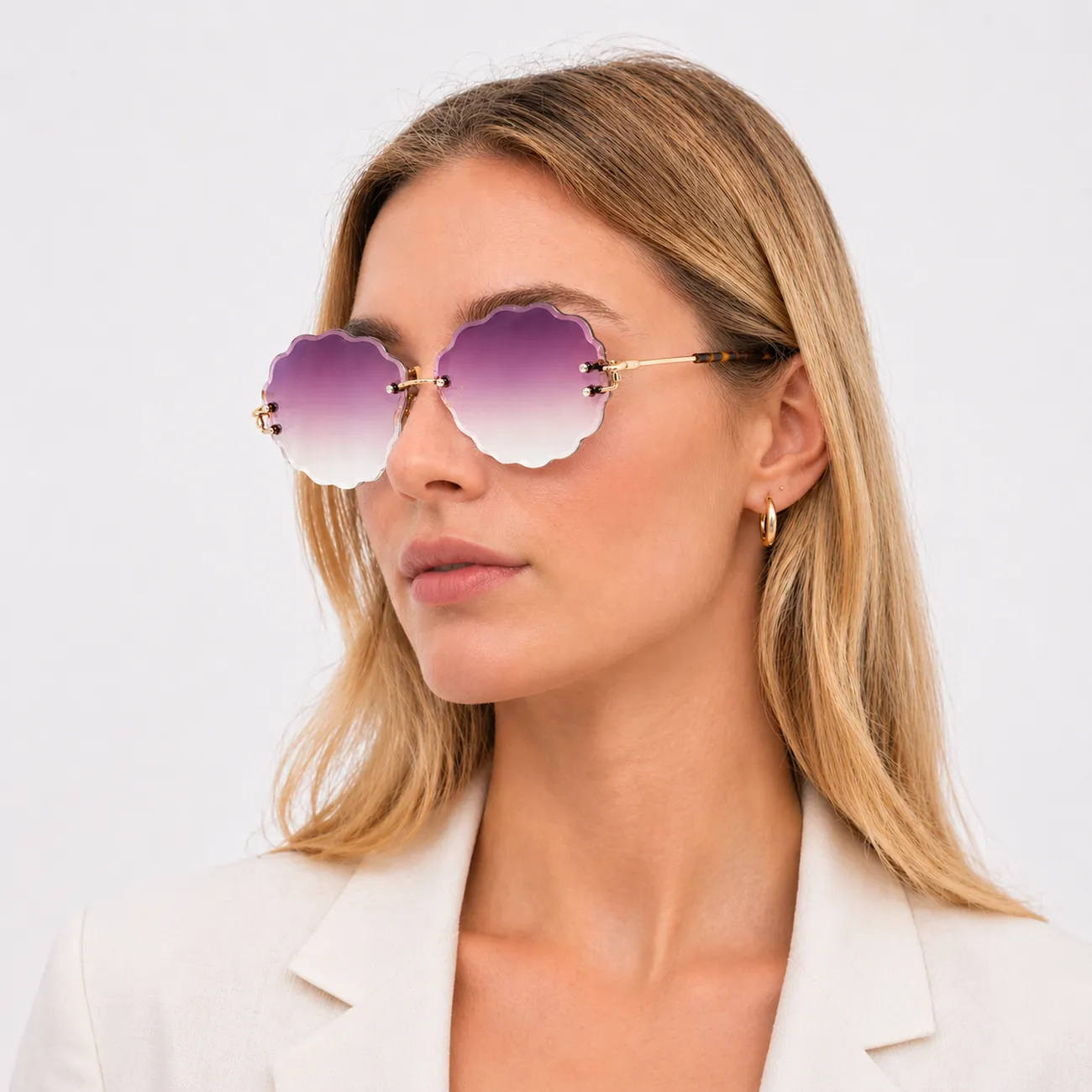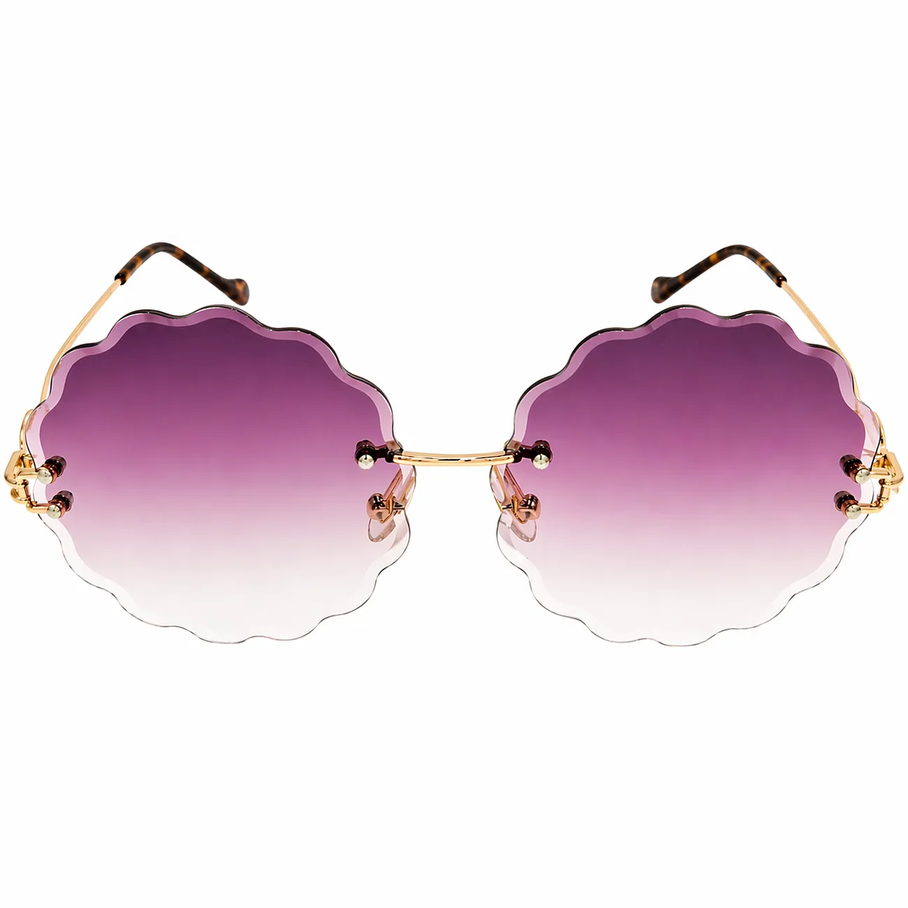 Too oma suvisele välimusele sügavat luksust, naiselikku salapära ja muinasjutulist kergust. Need unikaalsed raamita päikeseprillid võluvad oma merekarbi kuju meenutava lainelise servaga, mis annab aksessuaarile pehme ja voolava silueti. Sügavvioletne gradientklaas hajub pehmelt heledamaks, pakkudes lummavat värvidemängu, samas kui peened kuldsed sangad ja kilpkonnaluulised detailid lisavad välimusele rafineeritud “kalli” lõppviimistluse. See on kergusest ja ookeani sügavustest inspireeritud disain, mis muudab iga hetke päikese käes eriliseks.
