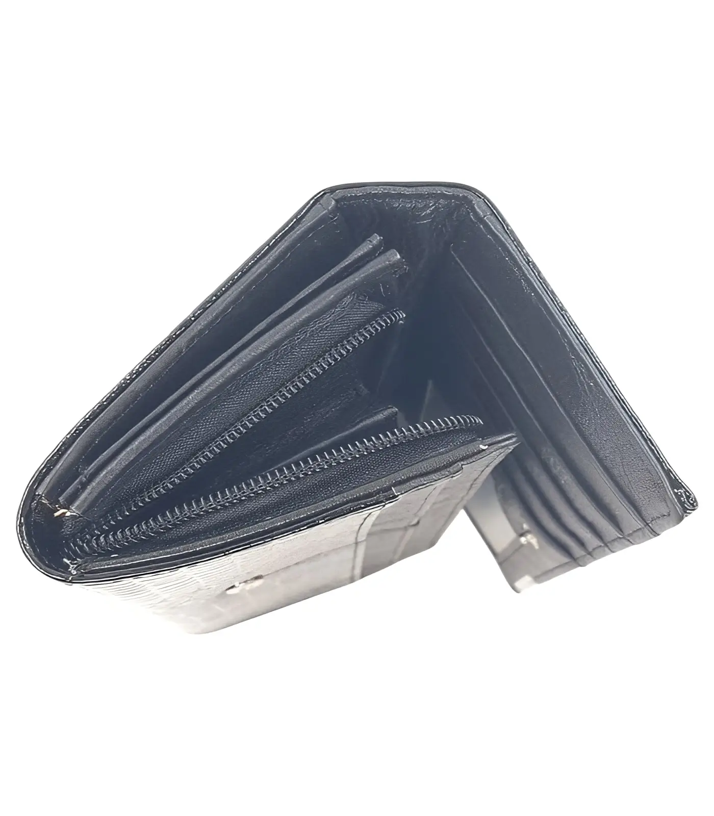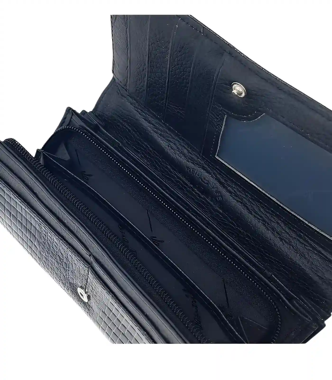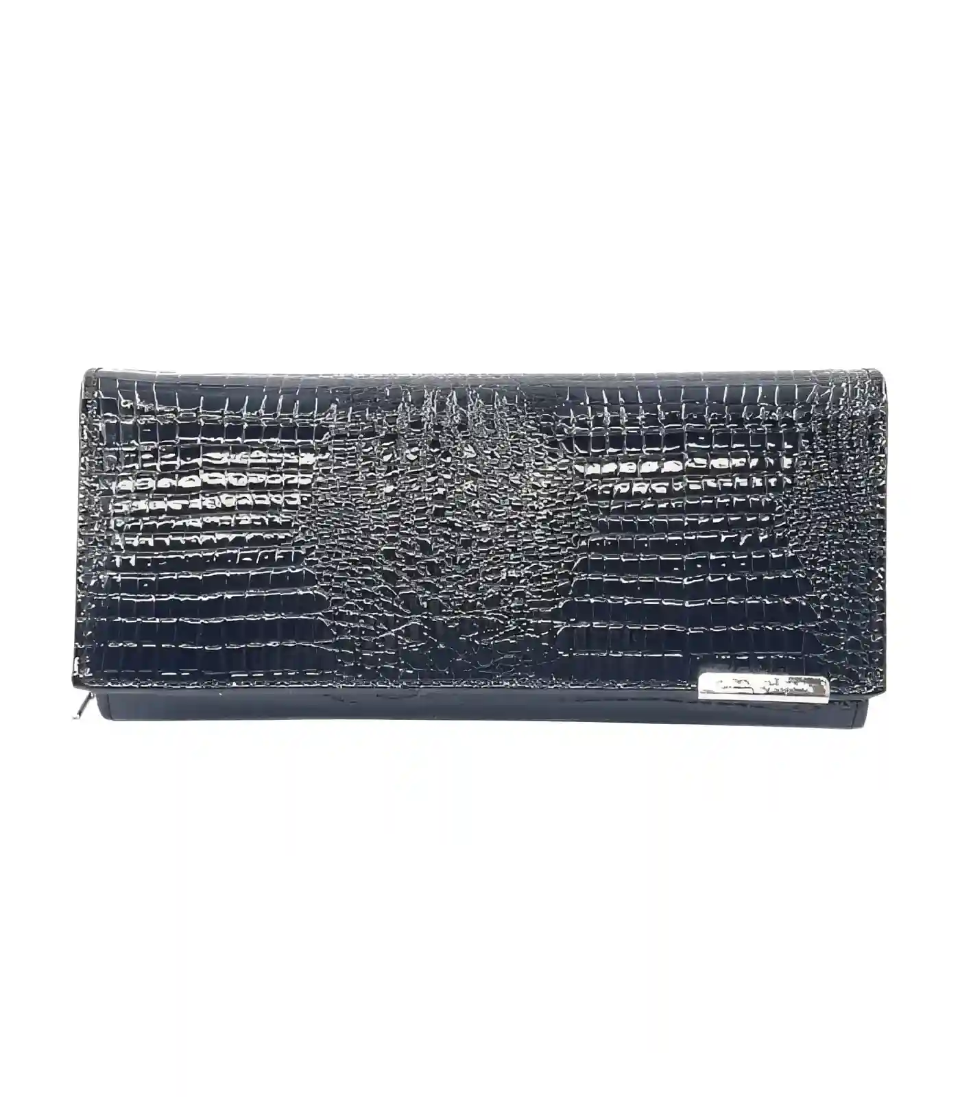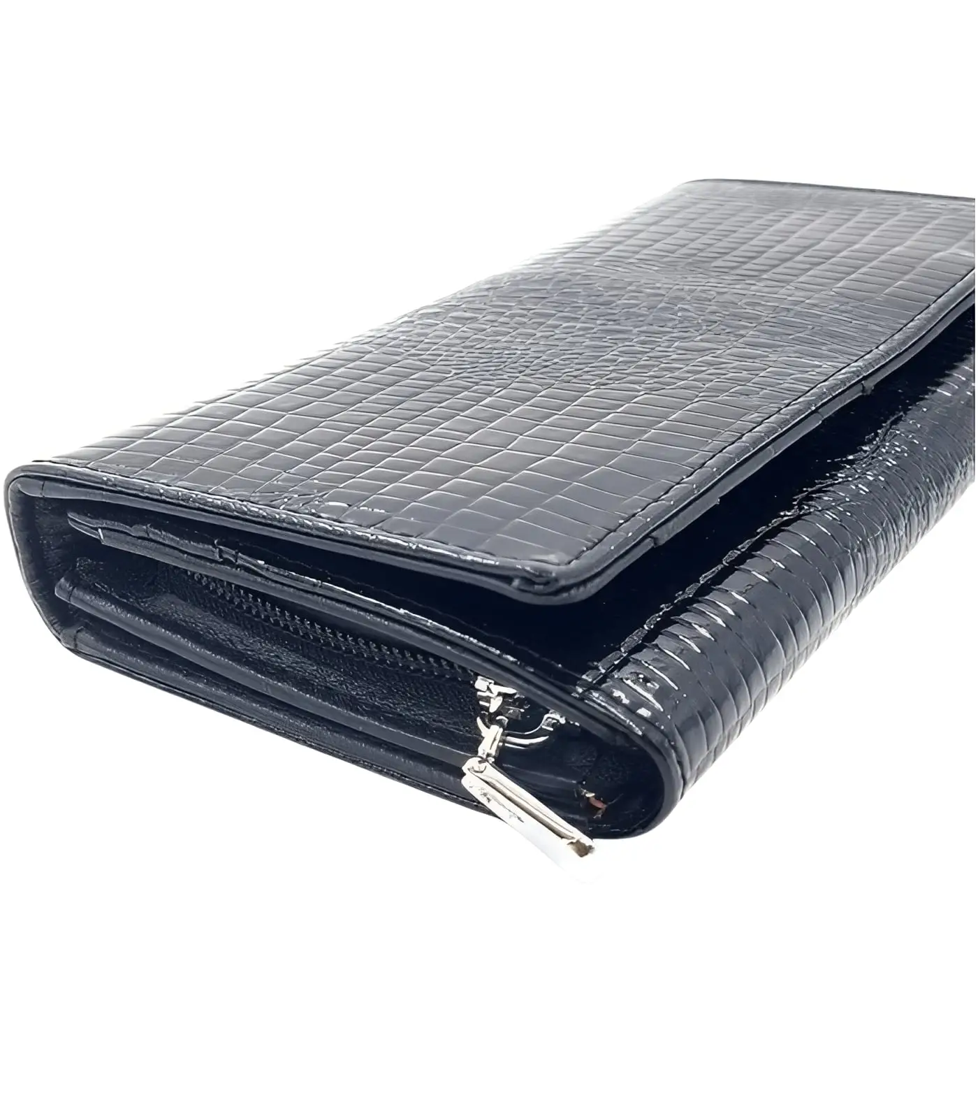 Täisnahast, musta värvi, läikiva ja krobelise mustriga, suur naiste rahakott.