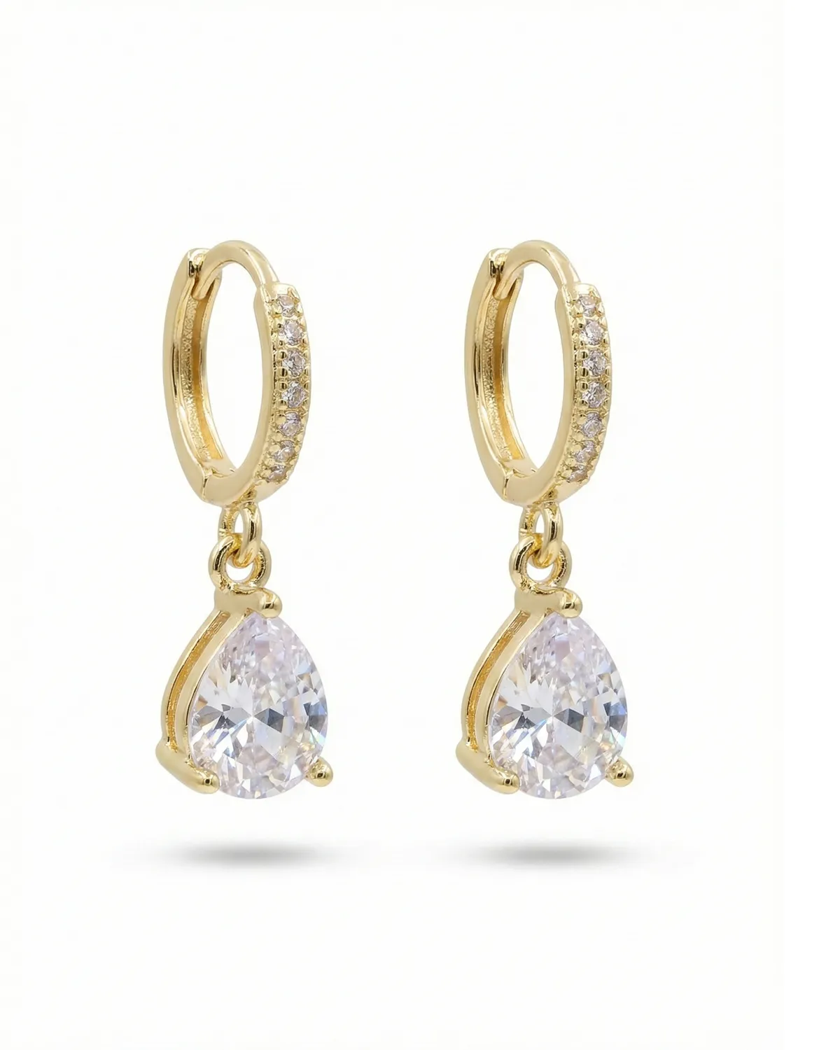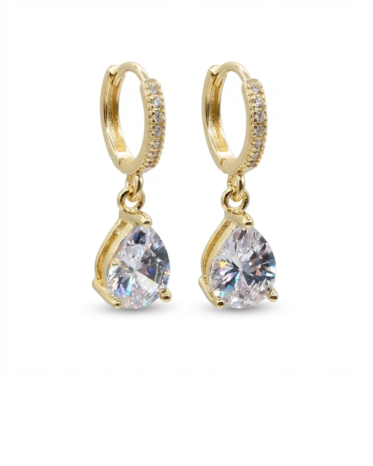 Elegantse disainiga kuldsed rõngaskõrvarõngad, mida kaunistavad tilgakujulised sädelevad kristallid ja säravad detailid.