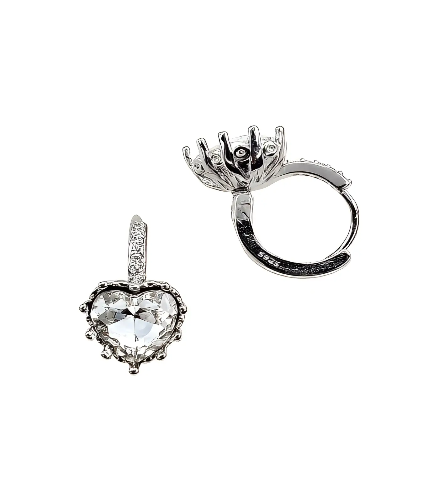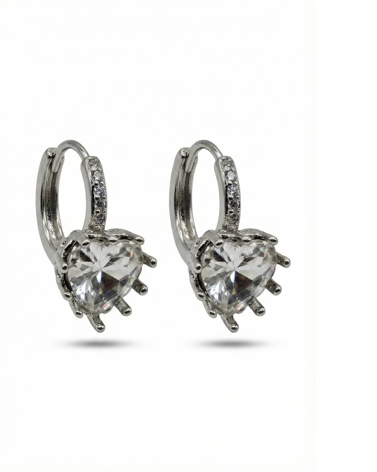 Hõbedase raamiga südamekujulise läbipaistva kiviga ripatskõrvarõngad, kaunistatud väikeste sädelevate detailidega.