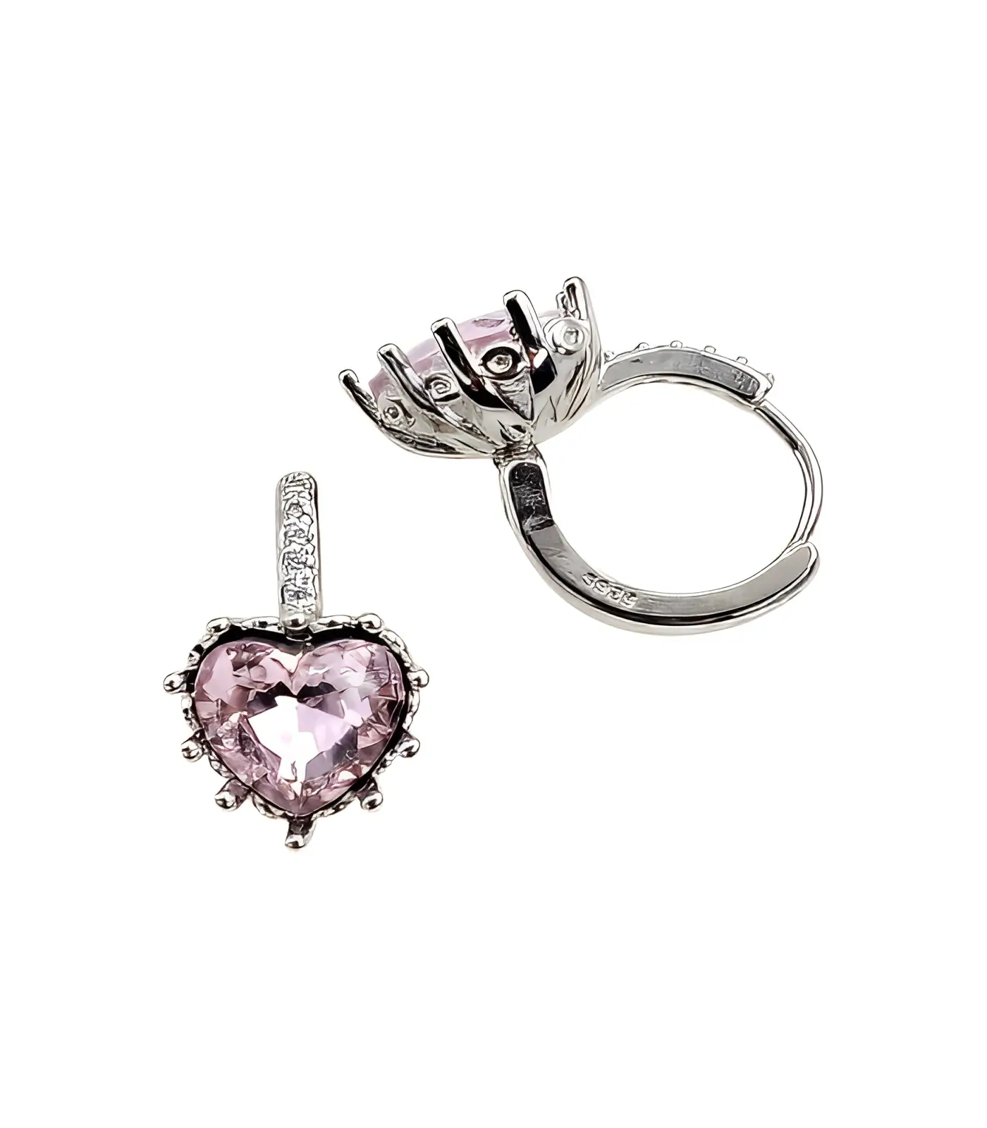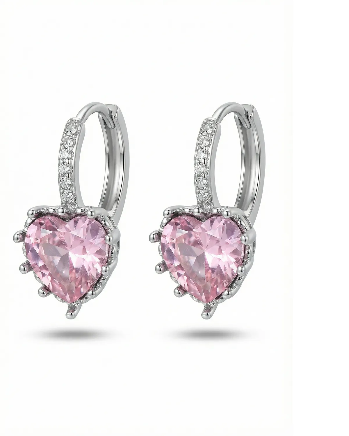 Südamekujulise roosa kiviga hõbedased ripatskõrvarõngad, kaunistatud väikeste sädelevate kristallidega.