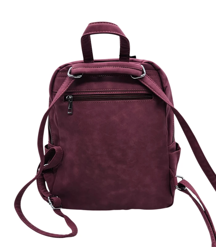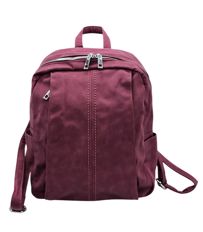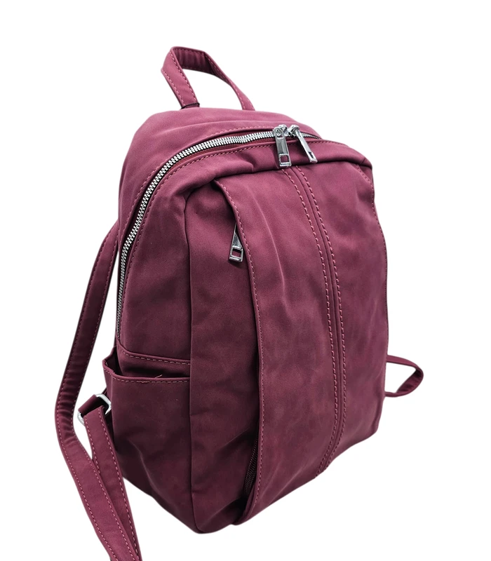 Lilla seljakott, mis on valmistatud kvaliteetsest kunstnahast sametise tekstuuriga.