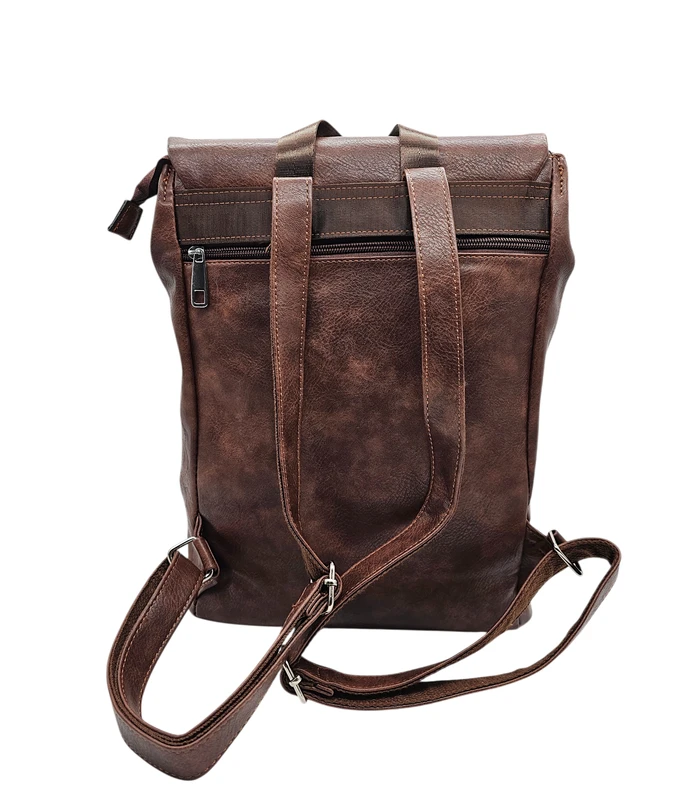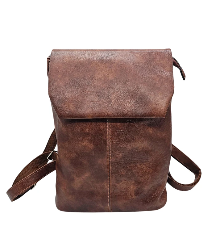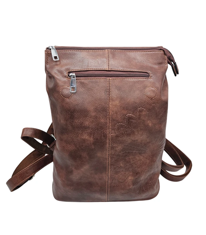 Pruun seljakott kvaliteetsest kunstnahast. Ühele küljele on kunstnahale pressitud elegantne lillemuster, mis lisab ainulaadse aktsendi. Kotil on pealt klapp ja tagaküljel mugav lukuga tasku väiksemate esemete jaoks. Sobib ideaalselt igapäevaseks kandmiseks ning mahutab ka sülearvuti.