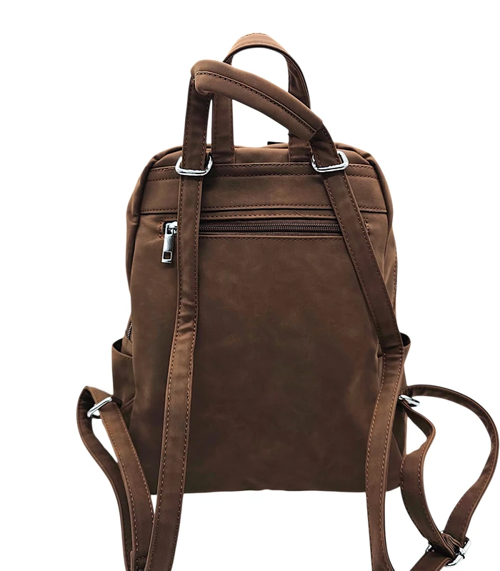 Pruun seljakott, mis on valmistatud kvaliteetsest kunstnahast sametise tekstuuriga. Klassikaline ja vastupidav disain, mis sobib suurepäraselt igapäevaseks kasutamiseks.